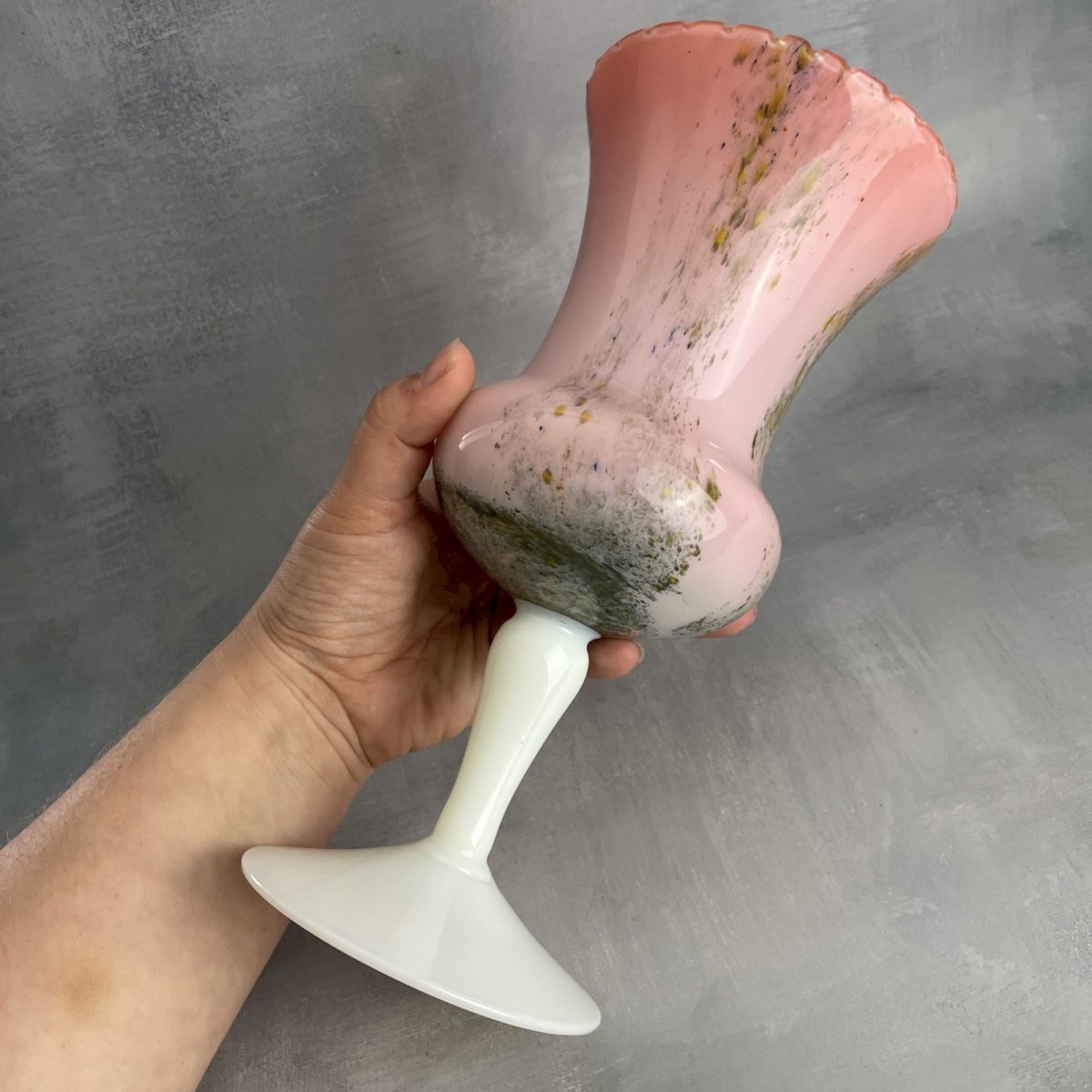 Vase coupe sur pied en opaline multicouches blanc et intérieur orange ~24.5cm