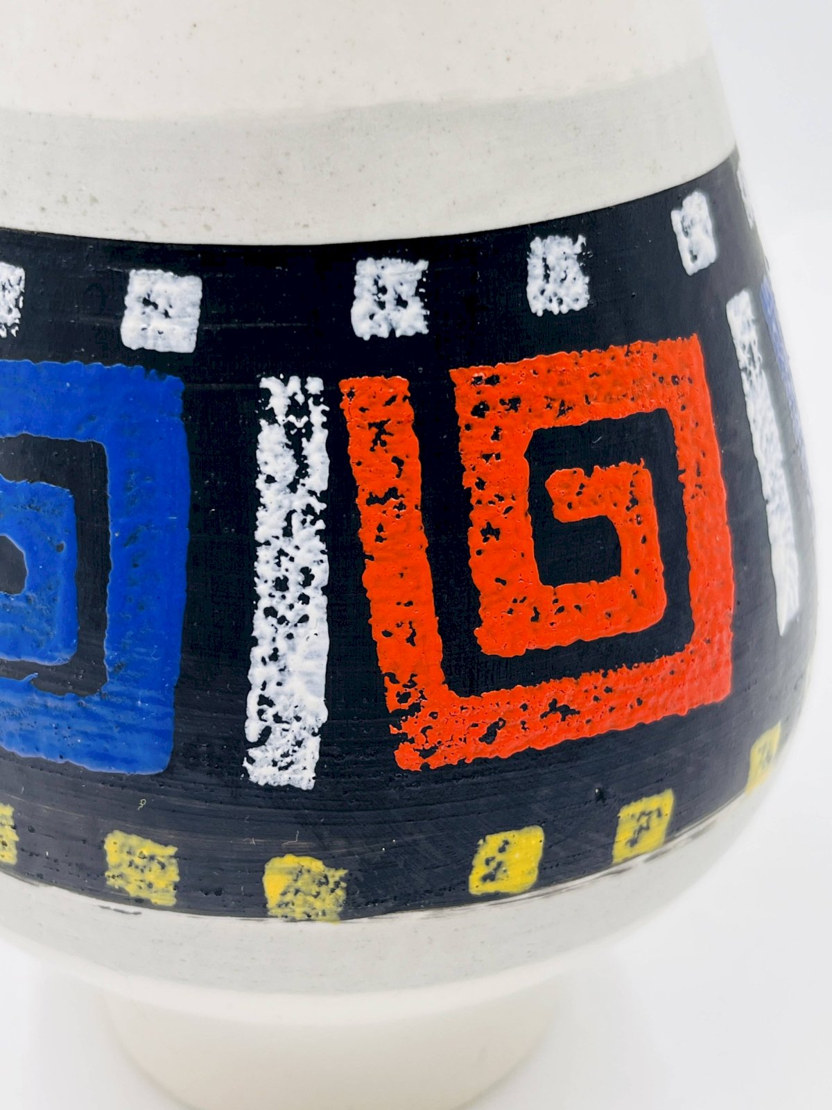 Sa forme gracieuse est ornée d'un motif géométrique saisissant aux teintes vibrantes de rouge, bleu et jaune, sur un fond blanc et noir classique.