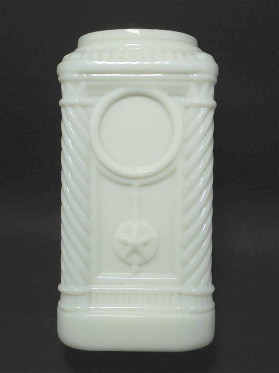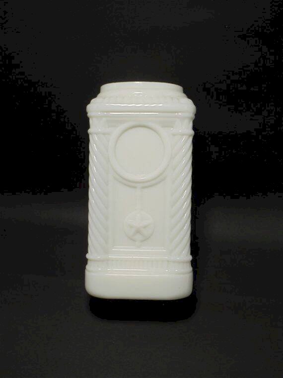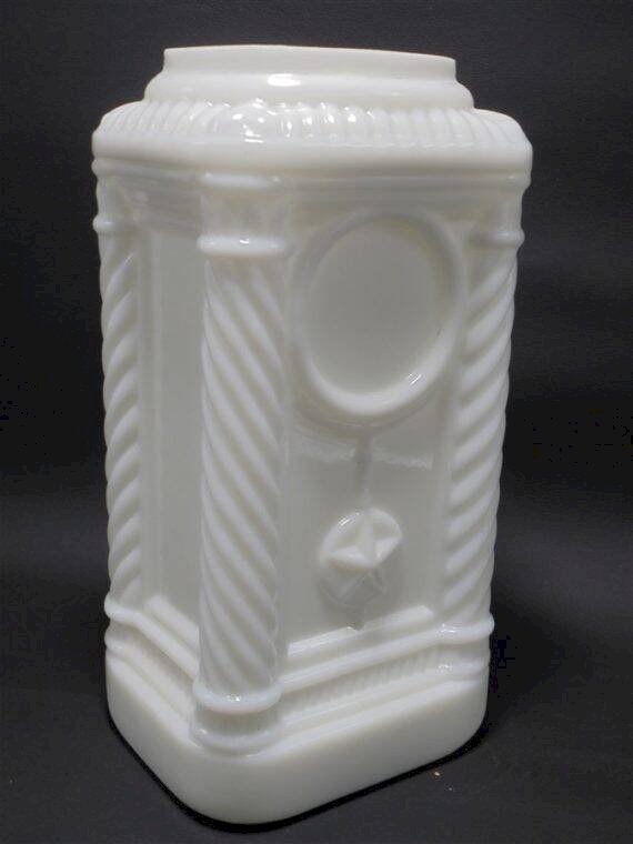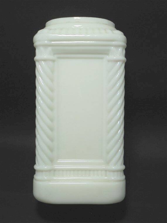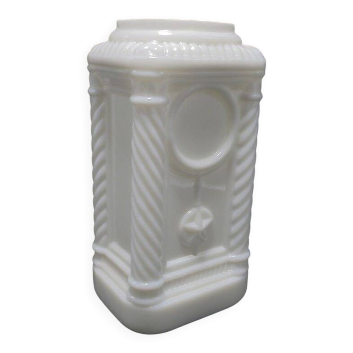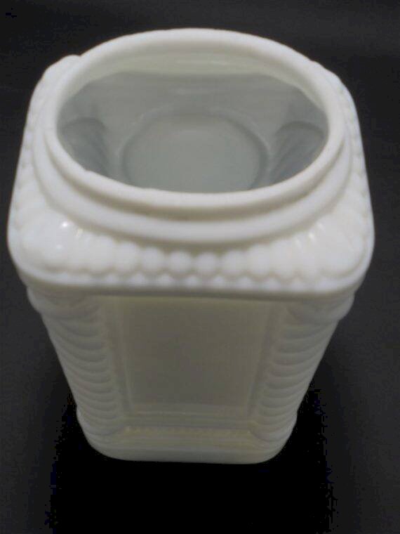 Pot en opaline blanche, les 4 angles forment 4 colonnes,il lui manque apparemment son couvercle.Il peut maintenant servir de vase par exemple.Largeur : 11.5 cmHauteur : 22.5 cmPoids : 1.210 g