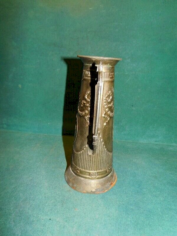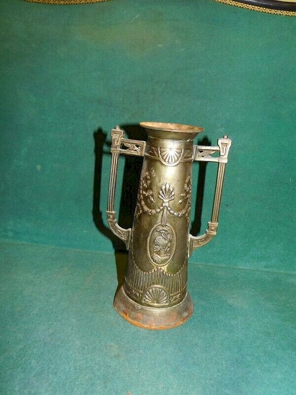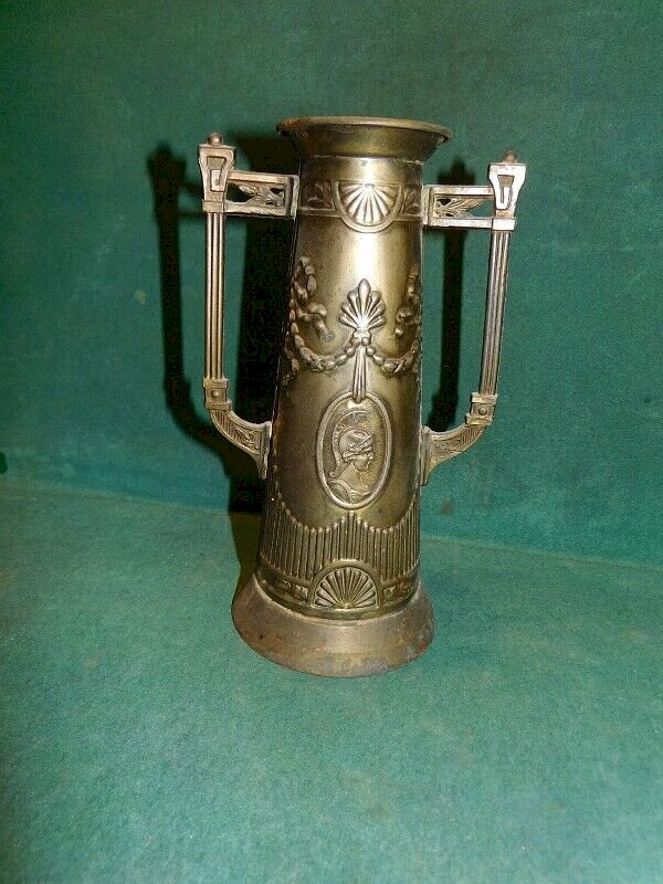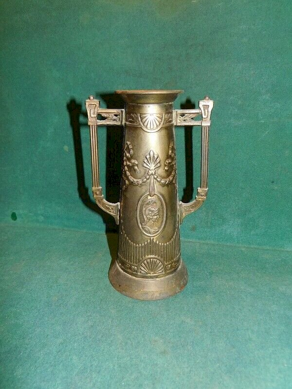 joli vase en tôle doré décor grec il est en bon état il a juste des traces de rouilles il mesure 20.5 cm de haut sur 12.2 cm de large et 9.5 cm de diamètre pour le pied Matière:TOLE Origine:GRECE Type:VASE