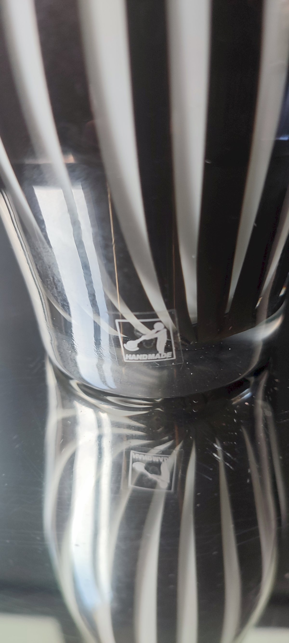 Vase en verre soufflé bouche avec décor rayé noir et blanc séries Zebra de Leonardo , forme cylindrique légèrement étirée se termine par un col resserré présence à la base de l'étiquette d’origine "Handmade" "mouth blown" confirmant sa fabrication artisanale.