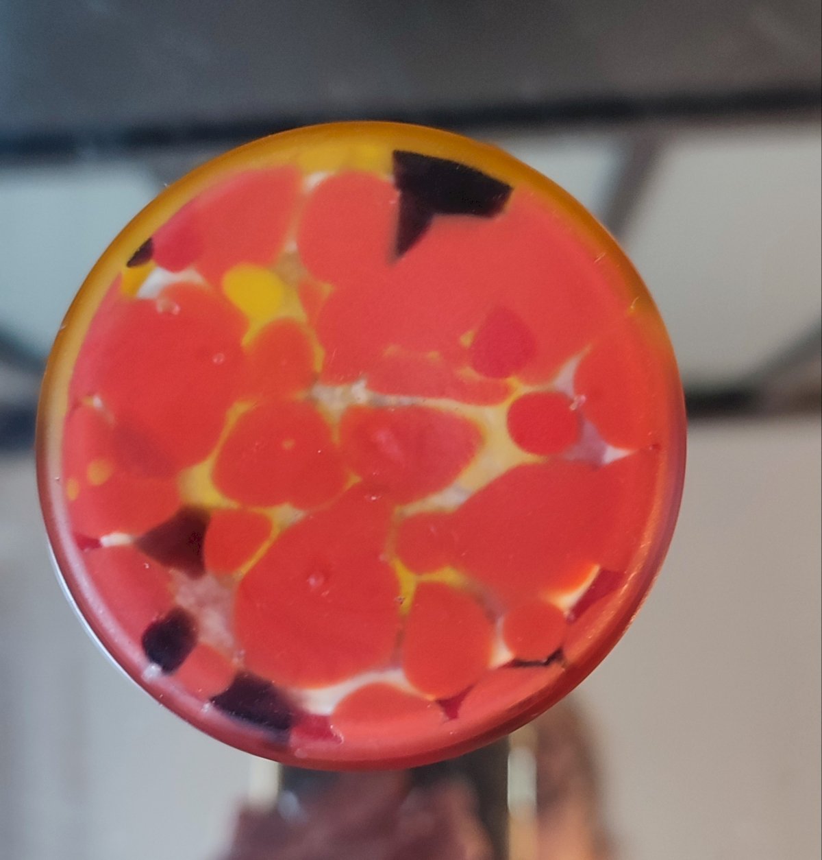 Petit vase en pâte de verre décor éclaté aux tons jaunes avec base rose/rouge mouchetée noir , couleurs incluses dans la masse.