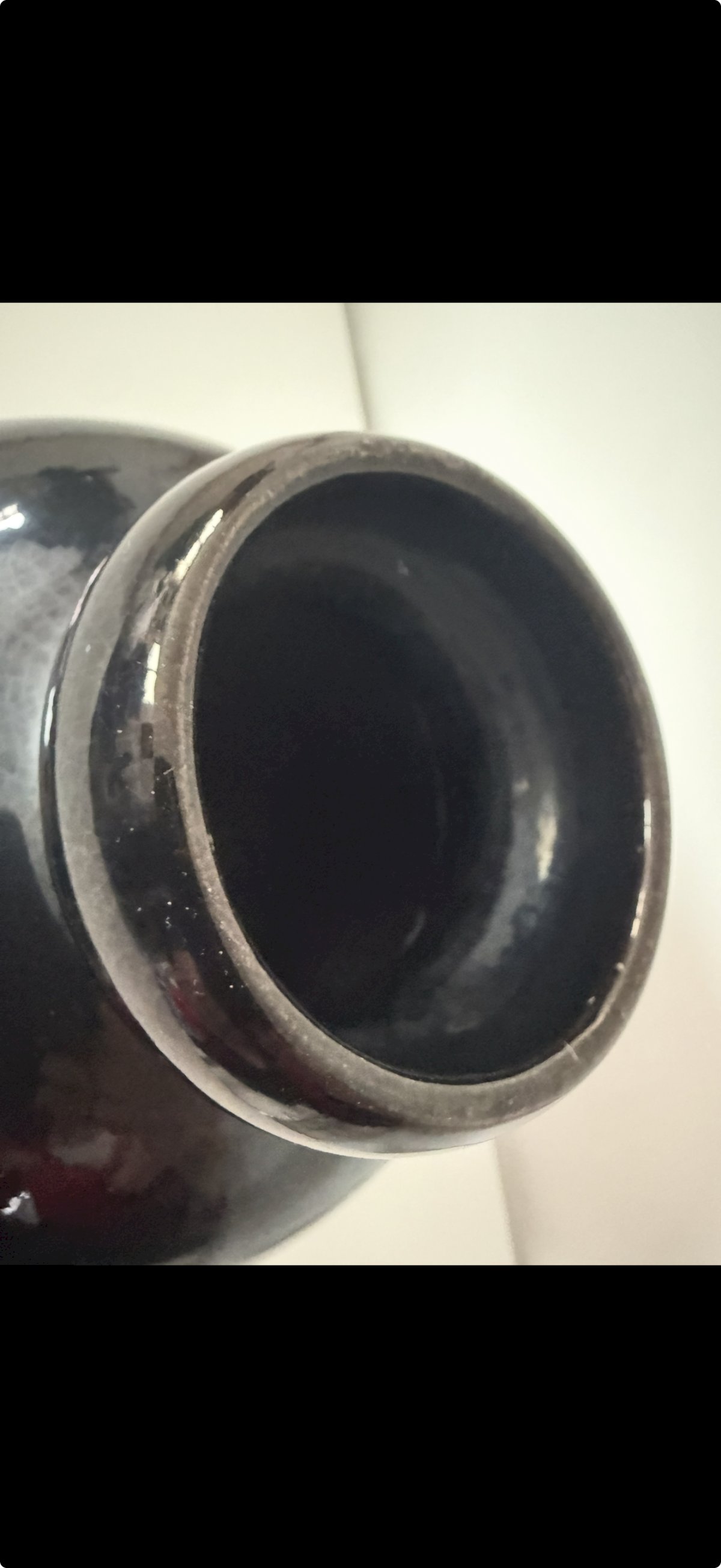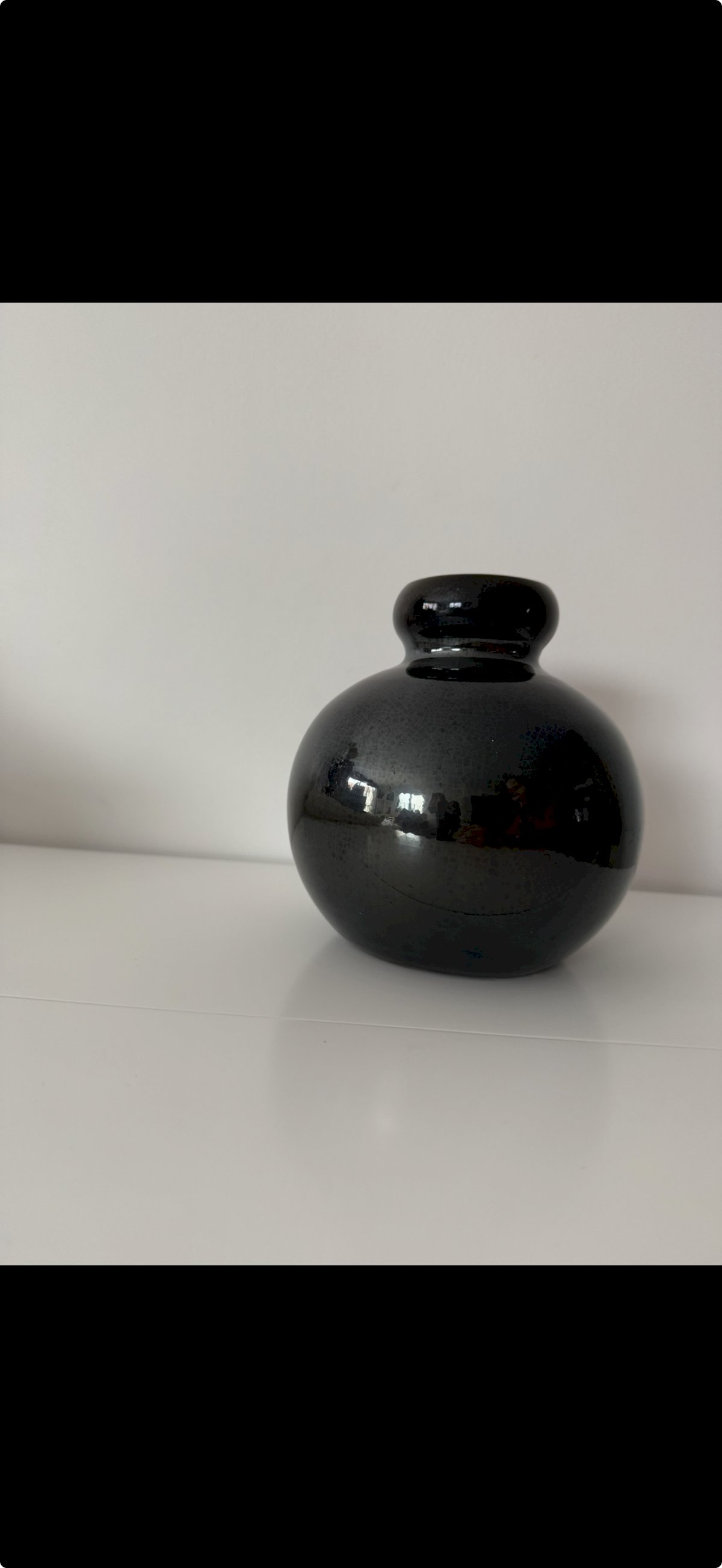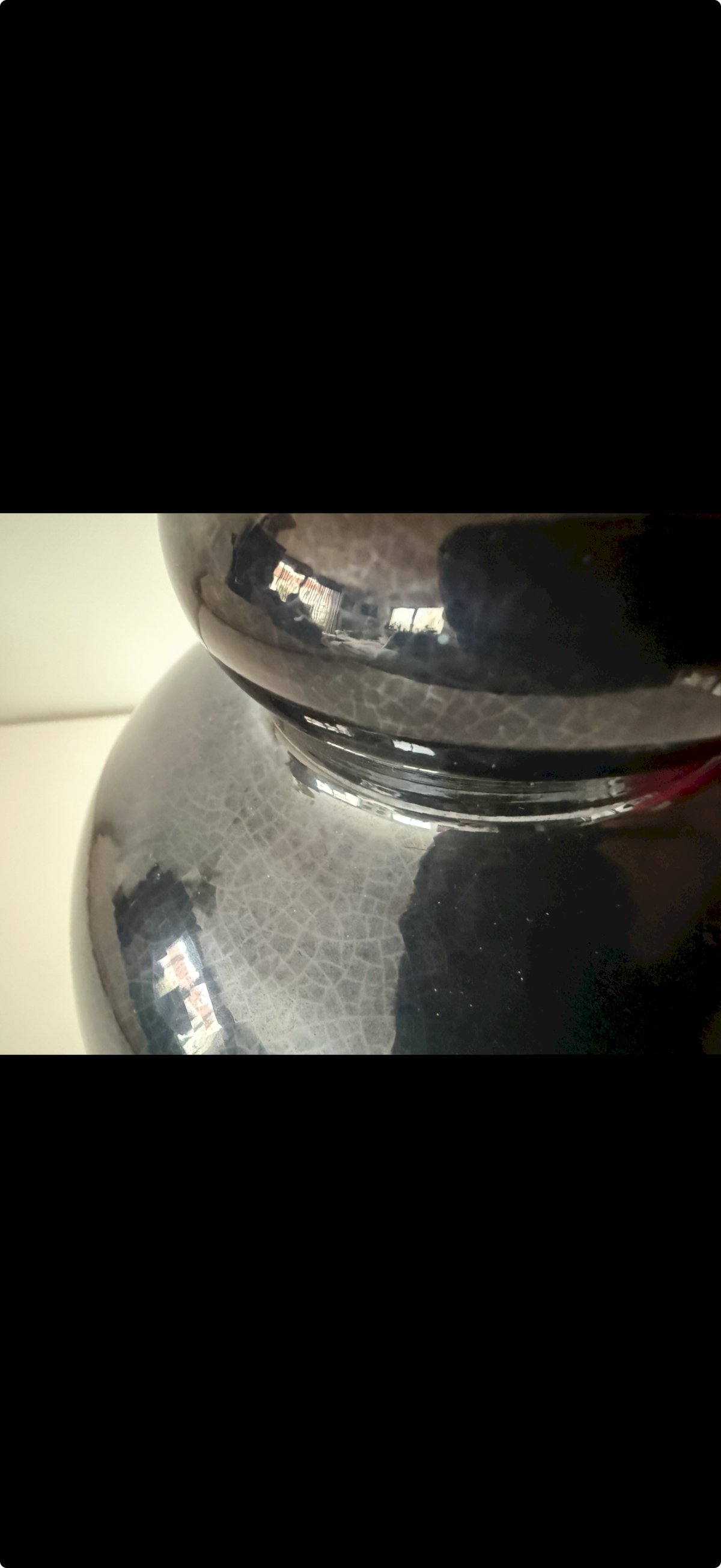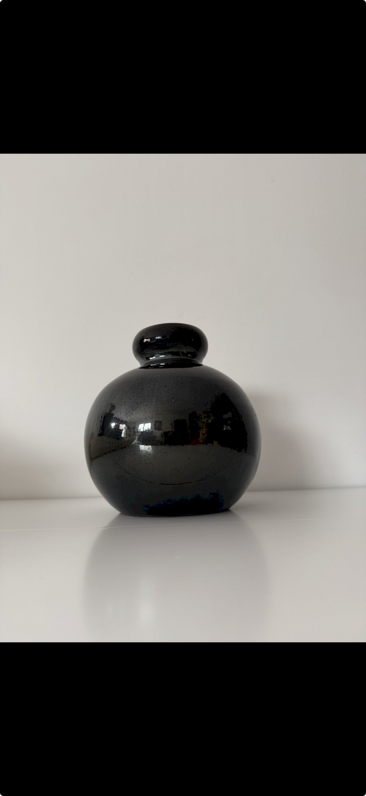 VASE Boule "NOIR brillant " Céramique émaille craquelée JEAN GAZIELLO à VALLAURIS, numéroté 71 Diamètre centrale 16cm son ouverture 7cm hauteur 19cm. de couleur noir brillant avec de magnifiques craquelures qui lui donne un visuel de multitude miroir qui reflète ce noir profond, sa forme ronde et son col à rebord. UNE BELLE PIECE POUR LES COLLECTIONNEURS.