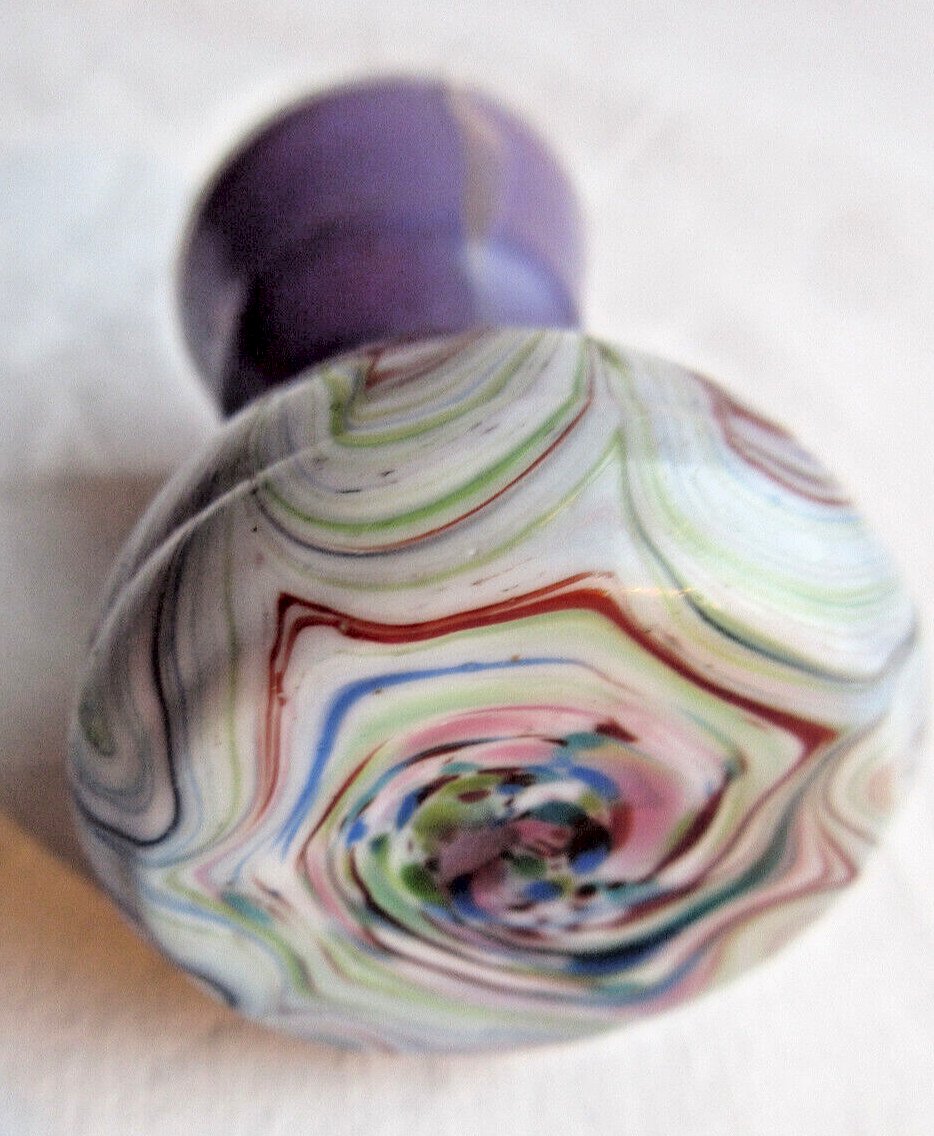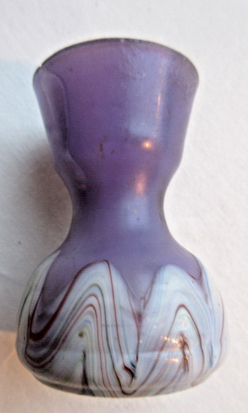 Vente dans le monde entier. Vase miniature Art Nouveau. Superbe vase miniature de représentant. Il est en pâte de verre irisée, couleur prune pour le haut et multicolore pour le bas. Diamètre ouverture: 3 cm, base: 3,8 cm. Hauteur: 5,5 cm. Etat d'usage avec un cheveu sur le goulot, voir photo 3. Joli vase à collectionner. Les photos complètent la description.
