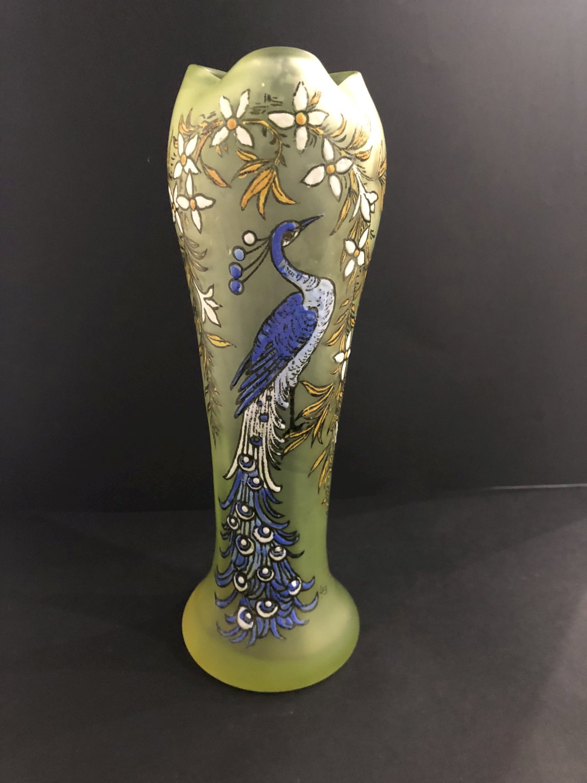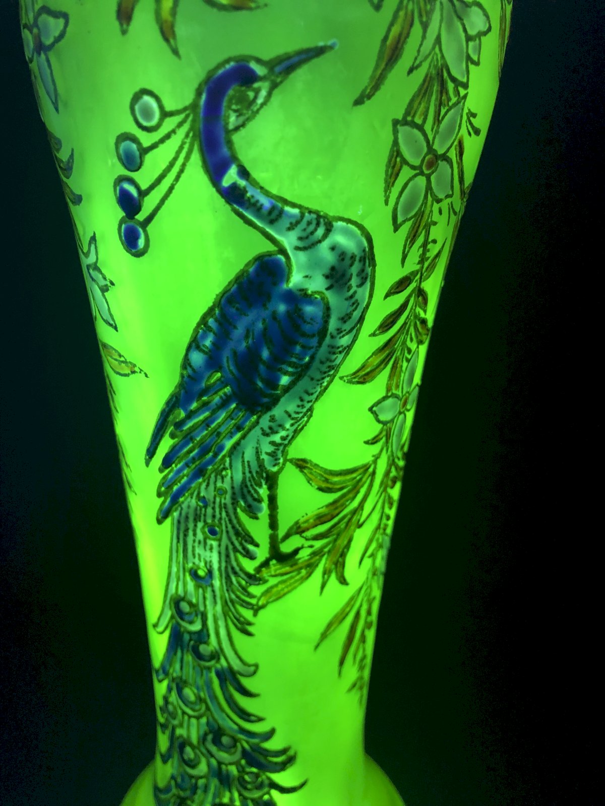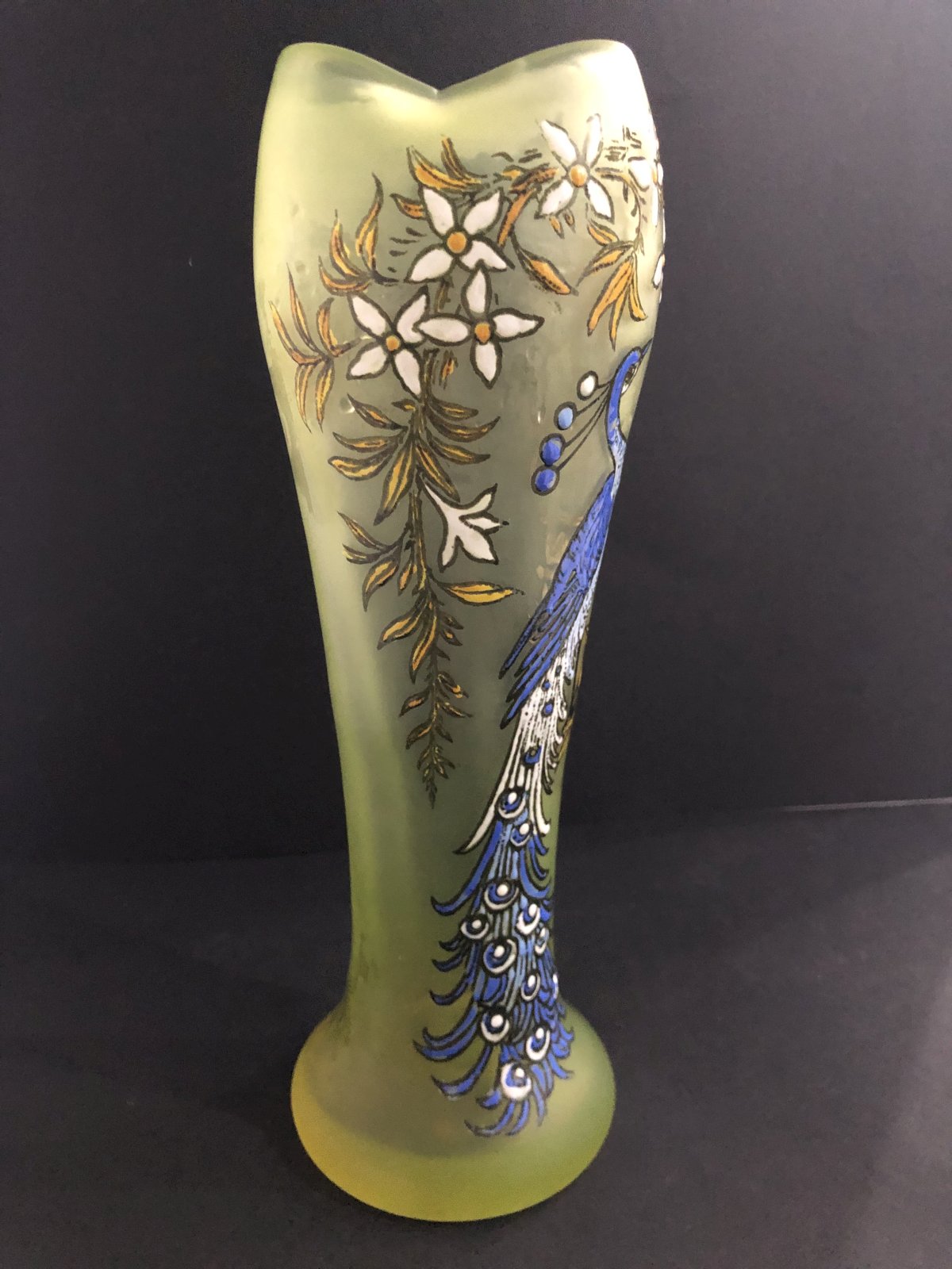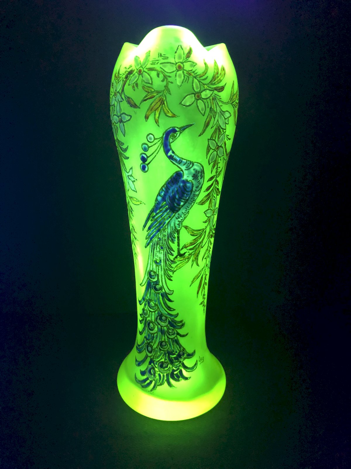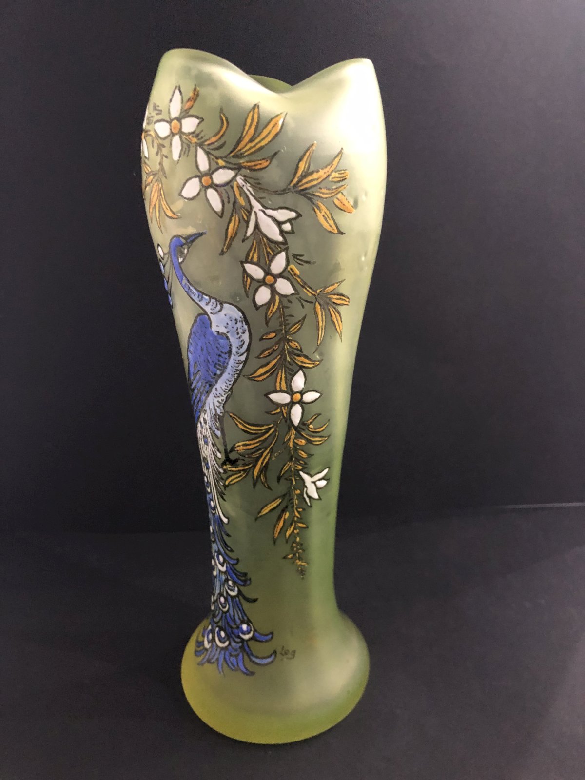 Très beau vase vintage "Art nouveau" en ouraline (verre à l'uranium) et décor paon en céramique signé LEGRAS "leg" sur le vase. la mention "leg" correspond à François-Théodore Legras maître verrier français (1839-1916). Le vase ne présente aucun fêle, sur le haut du vase il s'agit d'un effet plié.