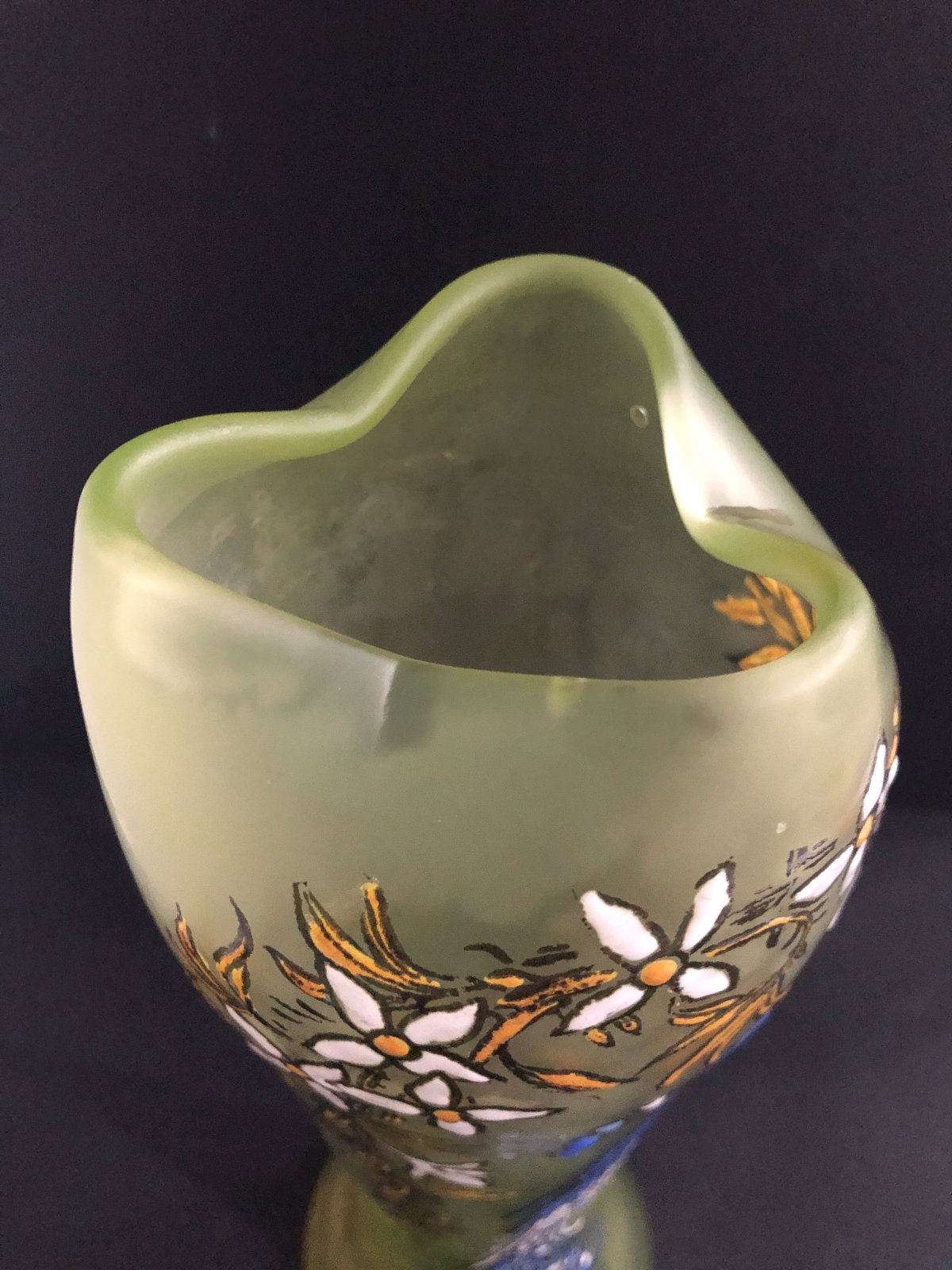 -JOLI ANCIEN VASE VERRE soufflé Vert col Long décor peint verre avec bulles D