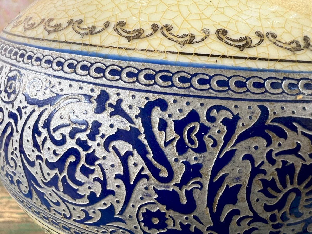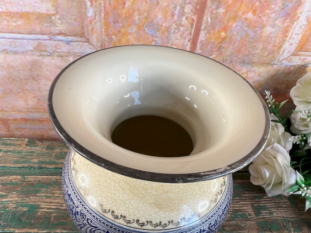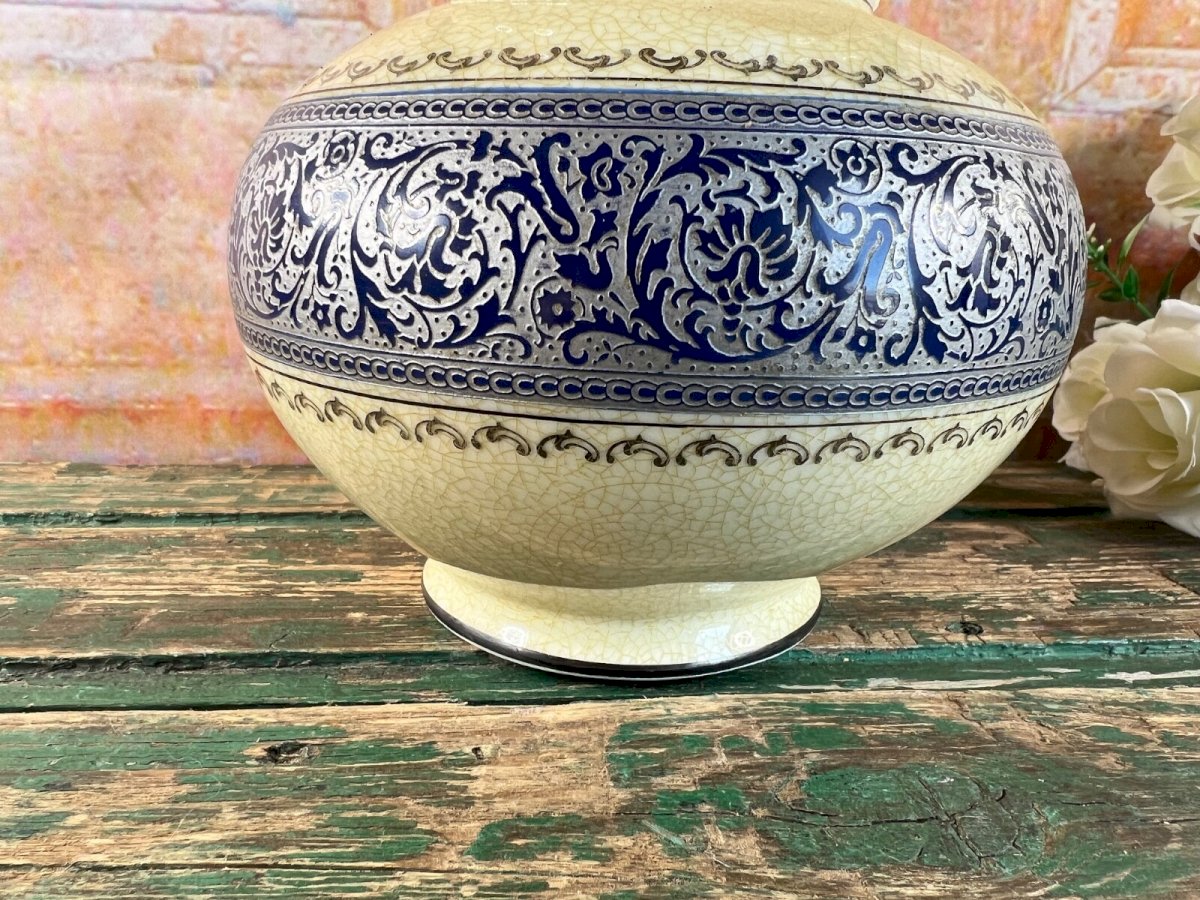 Vase ancien Thomas Ivory Bavaria – Rosenthal – Brokat DRP 655505 – Art Déco Superbe vase ancien en céramique Thomas Ivory Bavaria , issu du groupe Rosenthal Konzern , portant la mention Brokat – DRP 655505 (brevet déposé en Allemagne au début du XXᵉ siècle). Décoré d’une bande bleu cobalt finement travaillée de motifs feuillagés, ce vase présente une glaçure craquelée élégante et typique des productions allemandes Art Déco. Marques au revers Thomas Ivory Bavaria – Germany Brokat DRP No. 655505 Rosenthal Konzern N° peint à la main : 09347 / 1 Dimensions Hauteur : 17 cm Diamètre max : 15 cm État Très bon état : aucune fêlure, aucun éclat. Craquelure naturelle du temps. Un bel objet de décoration Art Déco , idéal pour console, bibliothèque, vitrine ou bouquet de fleurs séchées. ENGLISH VERSION Thomas Ivory Bavaria Vase – Rosenthal – Brokat DRP 655505 – Art Deco Elegant vintage ceramic vase by Thomas Ivory Bavaria , part of Rosenthal Konzern , marked Brokat – DRP 655505 (German patent). Blue cobalt ornamental band, crackled ivory glaze, Art Deco shape. Height 17 cm – Diameter 15 cm Very good condition. État:OccasionObjet ayant été utilisé. Objet présentant quelques marques d'usure superficielle, entièrement opérationnel et fonctionnant correctement. Il peut s'agir d'un modèle de démonstration ou d'un objet retourné en magasin après une courte période d'utilisation. les éventuelles imperfections. Antique:Non Matériau:Céramique Hauteur:17cm Fait main:Non Longueur:15cm Couleur:Bleu cobalt / Ivoire Marque:Thomas Ivory Bavaria Type:Vase Pays d'origine:Allemagne Pièces additionnelles requises:Non Style:Art déco