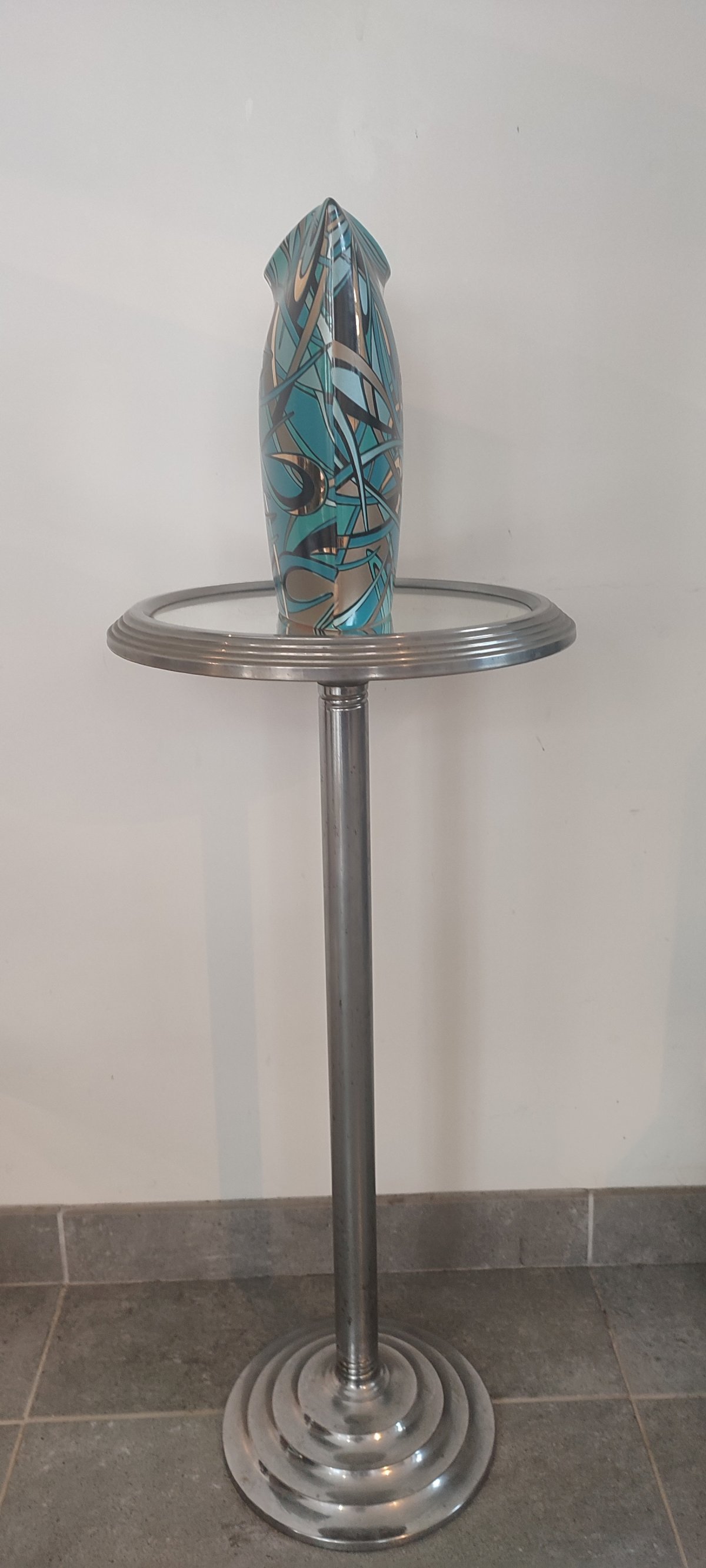 Le décor abstrait noir et doré sur fond turquoise met parfaitement en valeur la forme et donne au vase une vraie présence décorative.