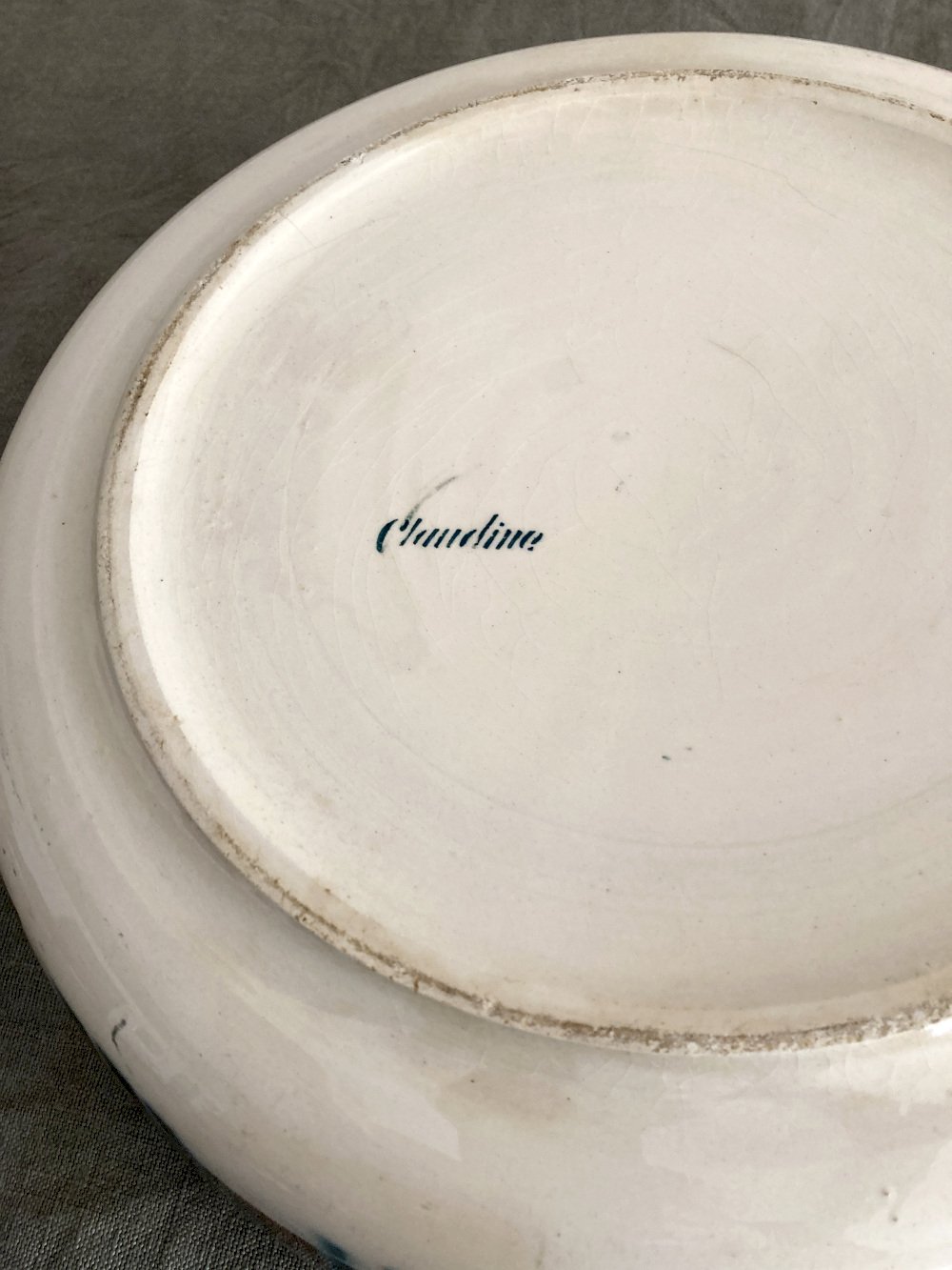 Ancienne vasque de toilette en céramique, modèle Claudine. Manufacture de fabrication non indiquée sur cet exemplaire. Probablement Digoin ou Sarreguemines. Motifs géométriques arts déco de couleur vert et brique. État satisfaisant, on note un petit éclat sur le rebord supérieur ainsi qu'un départ de fissure et quelques taches d'usage. Bel objet vintage qui comporte peu de défaut d'après son âge.