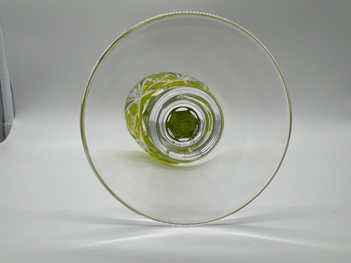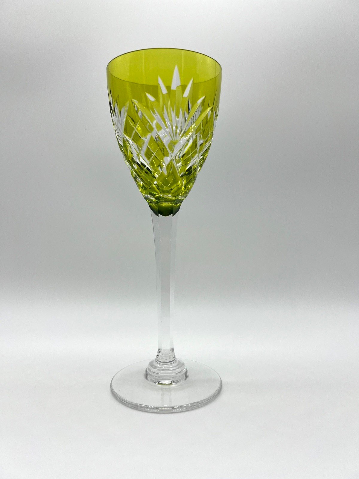 Cristallerie Saint Louis – Modèle Chantilly Rare verre à vin de type  Roemer  en  cristal doublé jaune , taillé main et signé  Saint Louis France . Ce modèle est soufflé bouche, taillé selon un décor croisé et feuillagé typique du modèle  Chantilly , créé dans la seconde moitié du XXe siècle. Le verre repose sur un pied transparent avec jambe haute facettée. Il s’agit d’un  verre de remplacement idéal  pour compléter un service existant. Caractéristiques : Marque :  Cristallerie Saint Louis Modèle :  Chantilly Couleur :  Jaune citron (overlay) Type :  Verre Roemer (vin blanc / vin doux) Technique :  Cristal doublé taillé main Signature :  Gravée à l’acide sous le pied :  Cristallerie Saint Louis France Hauteur :  23 cm Diamètre buvant :  7,5 cm Poids :  env. 270 g État : Excellent état – aucun éclat, aucune fêlure – brillant, propre, coupe nette.