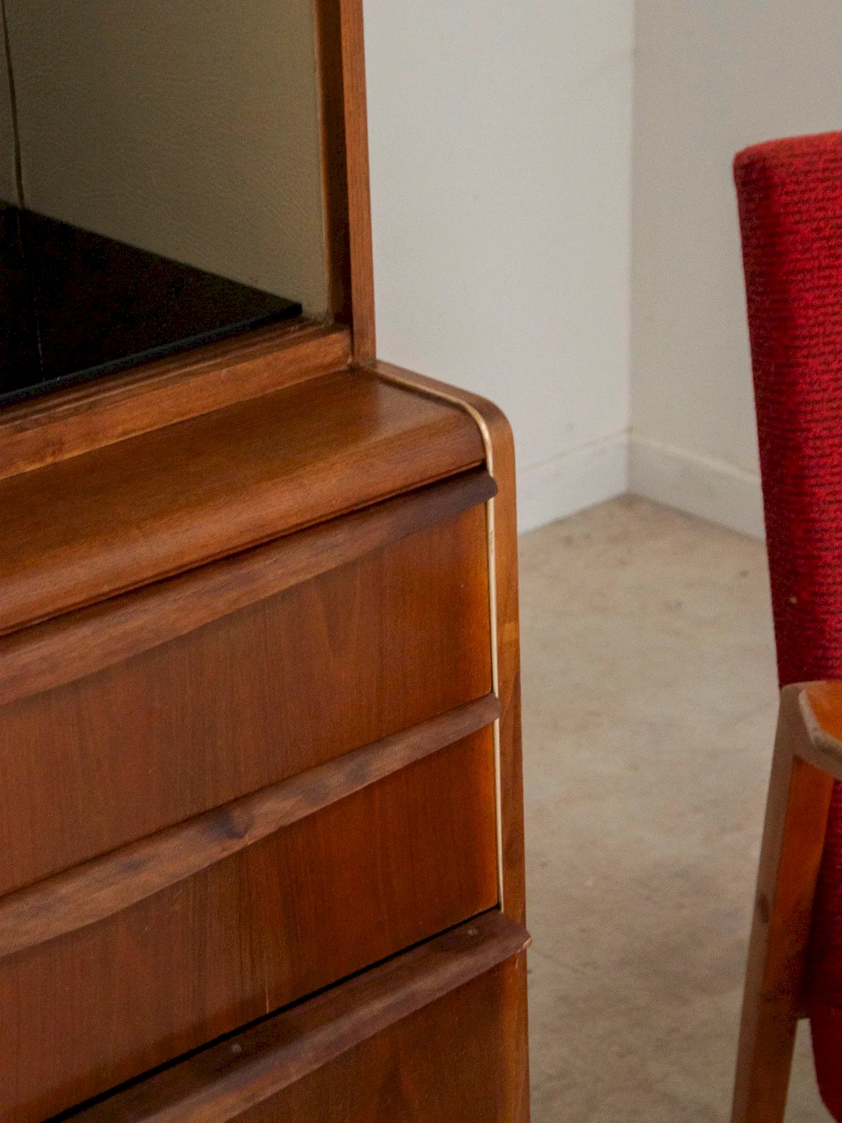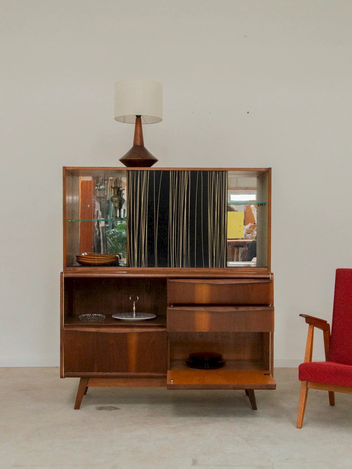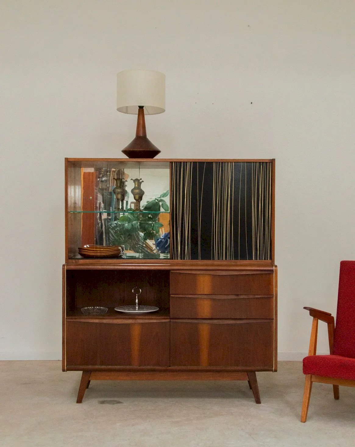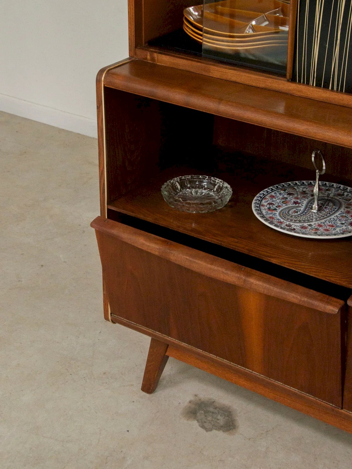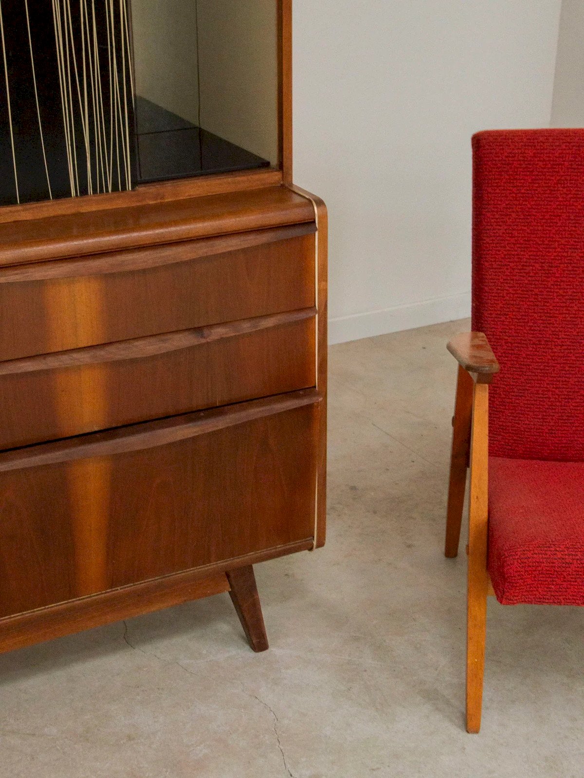 Apportez une touche élégante et chaleureuse avec cette vitrine en bois foncé, au jeu de contrastes entre une porte coulissante noire soulignée de liserés dorés et la patine profonde du bois. Ses proportions équilibrées offrent un bel équilibre entre présentation et rangement : une niche d'exposition, deux tiroirs pratiques et deux placards abattants pour vaisselle ou livres. Sa silhouette sobre et raffinée s'intègre aussi bien dans une salle à manger que dans un salon contemporain. Un abattant fonctionne moins bien. Longueur : 118 cm Largeur : 42 cm Hauteur : 136 cm Hauteur tiroir : 10,5 cm Hauteur de la niche : 26 cm Hauteur de l'étagère en verre : 26 / 28 cm État:Occasion: Objet ayant été utilisé. Objet présentant quelques marques d'usure superficielle, ...Occasion: Objet ayant été utilisé. Objet présentant quelques marques d'usure superficielle, entièrement opérationnel et fonctionnant correctement. Il peut s'agir d'un modèle de démonstration ou d'un objet retourné en magasin après une courte période d'utilisation. les éventuelles imperfections. Marque:Debongout Type:Produit chiné Matériau:Bois, Verre Style:Contemporain Personnalisé:Vaisseliers et vitrines