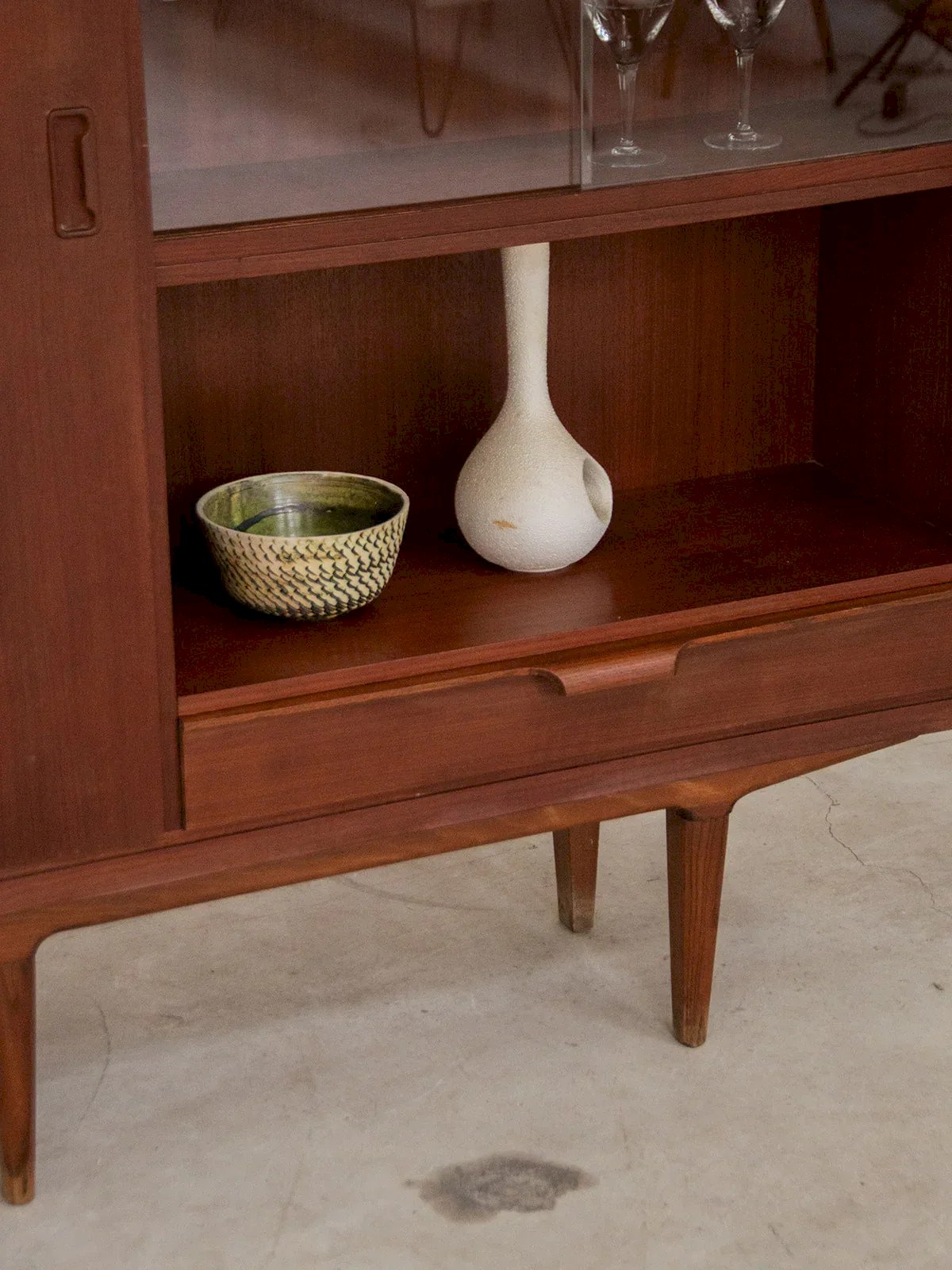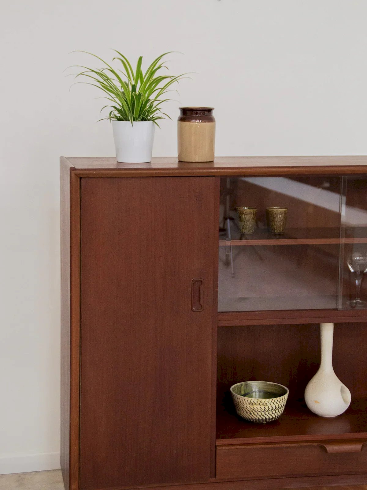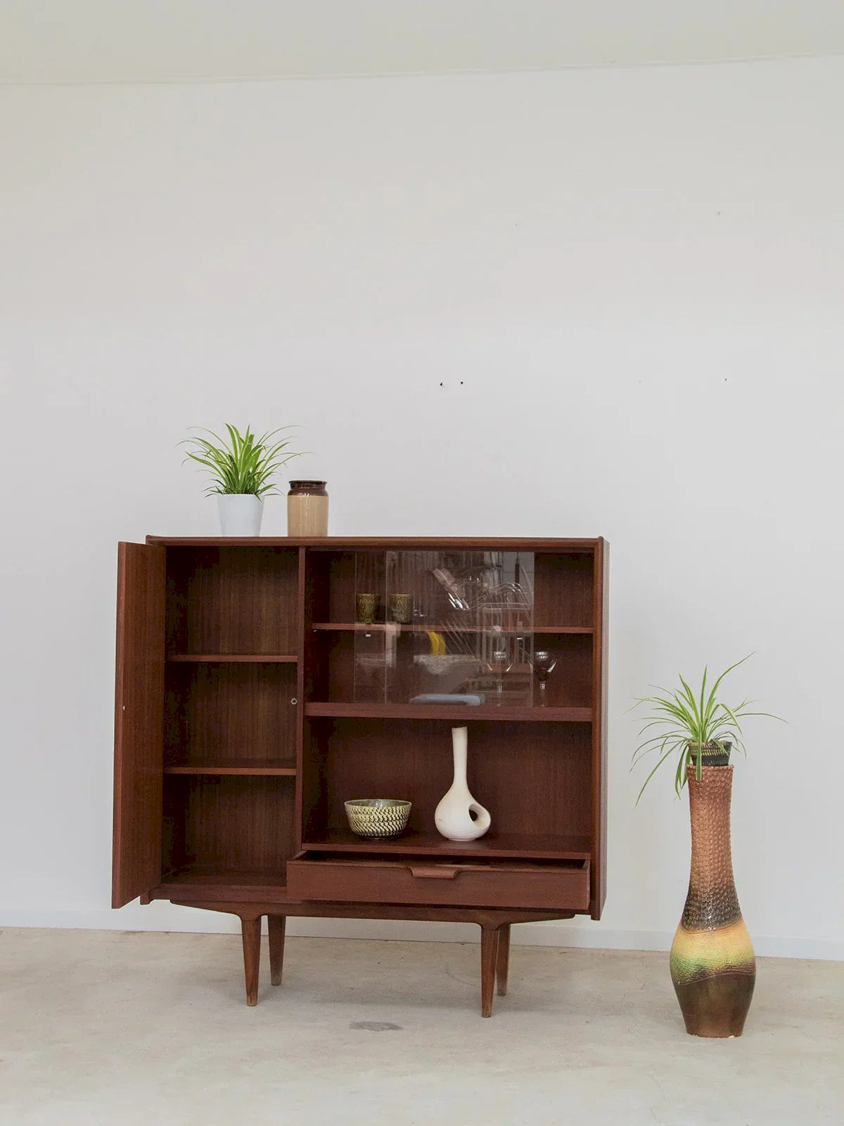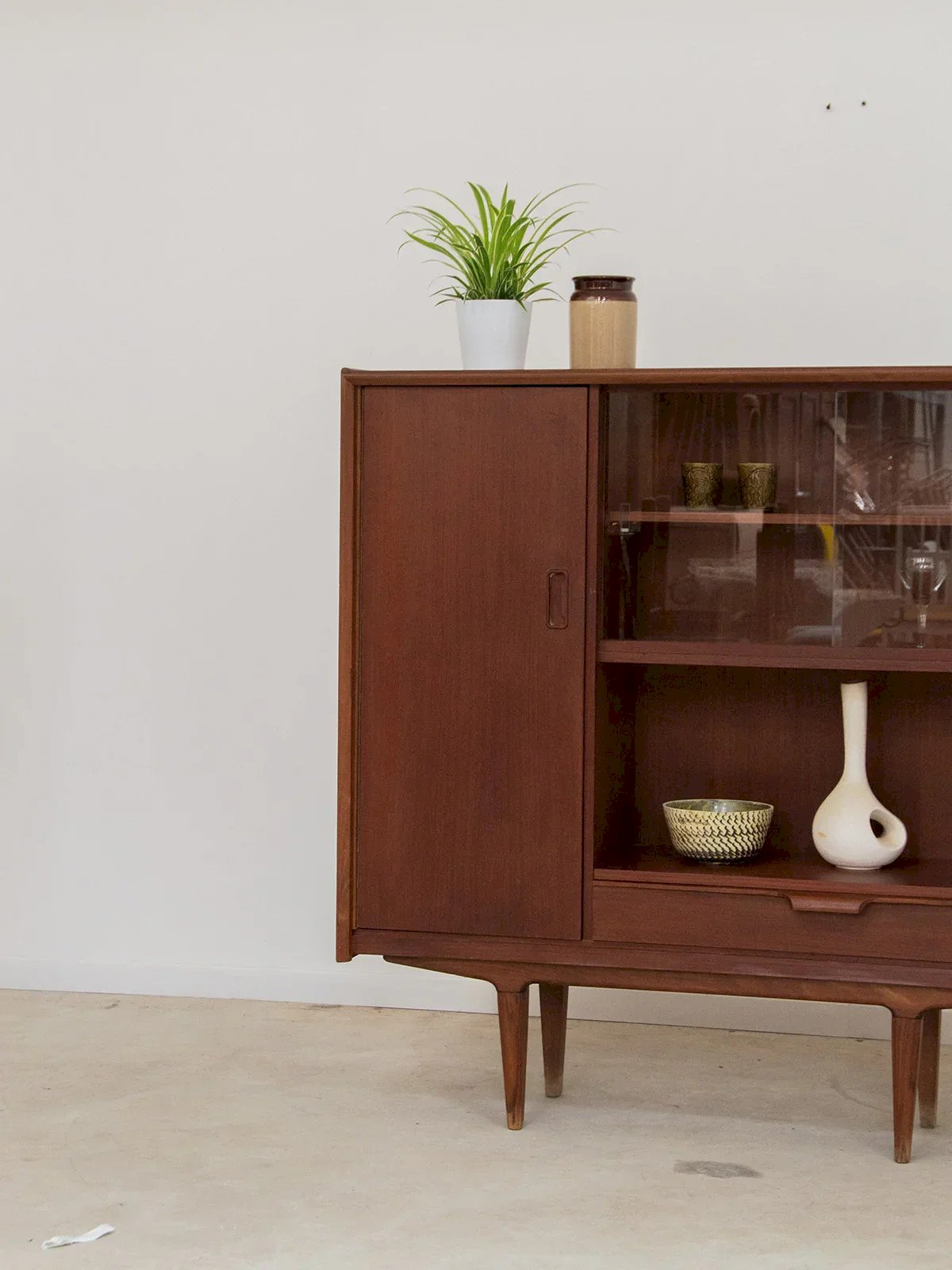 Apportez une touche scandinave à votre intérieur avec ce buffet en bois foncé et aux pieds fins. Doté d'étagères pratiques et d'un tiroir bas intérieur revêtu de rouge à l'intérieur, il allie fonctionnalité et esthétisme. Son placard spacieux vous permettra de ranger vos essentiels en toute élégance. Parfait pour ajouter du style et de l'organisation à votre salon ou salle à manger. Longueur : 124 cm Largeur : 37,5 cm Hauteur totale : 127 cm Hauteur de la case : 34 cm Hauteur tiroir inférieur : 12 cm Hauteur étagères placard : 29,5 État:Occasion: Objet ayant été utilisé. Objet présentant quelques marques d'usure superficielle, ...Occasion: Objet ayant été utilisé. Objet présentant quelques marques d'usure superficielle, entièrement opérationnel et fonctionnant correctement. Il peut s'agir d'un modèle de démonstration ou d'un objet retourné en magasin après une courte période d'utilisation. les éventuelles imperfections. Marque:Debongout Type:Produit chiné Matériau:Bois, Verre Style:Contemporain Personnalisé:Vaisseliers et vitrines