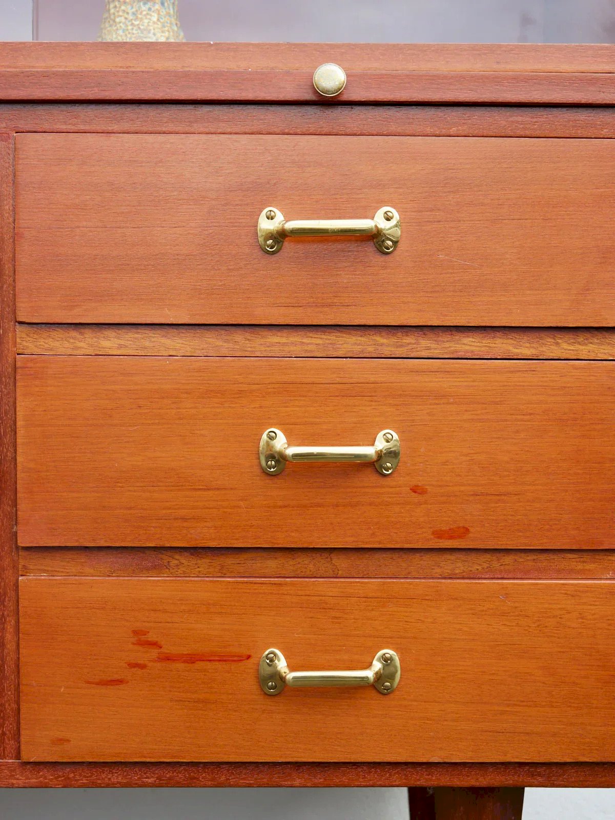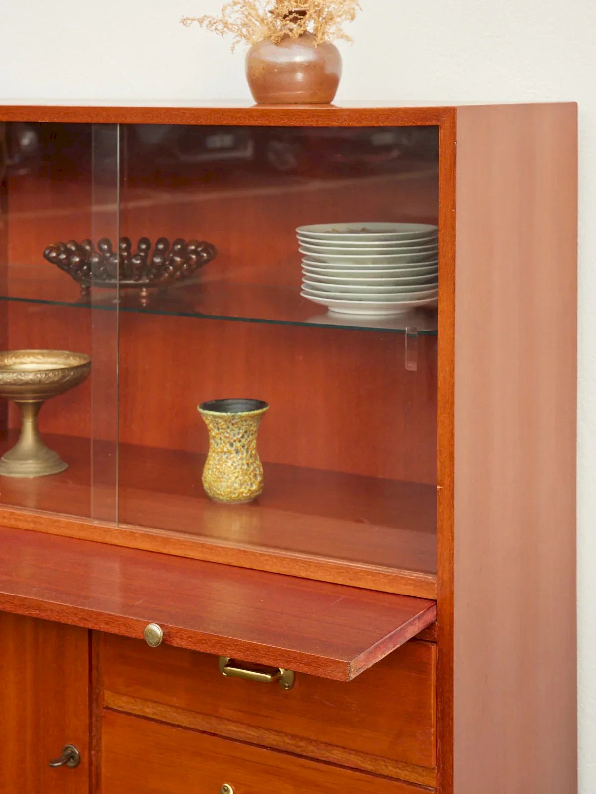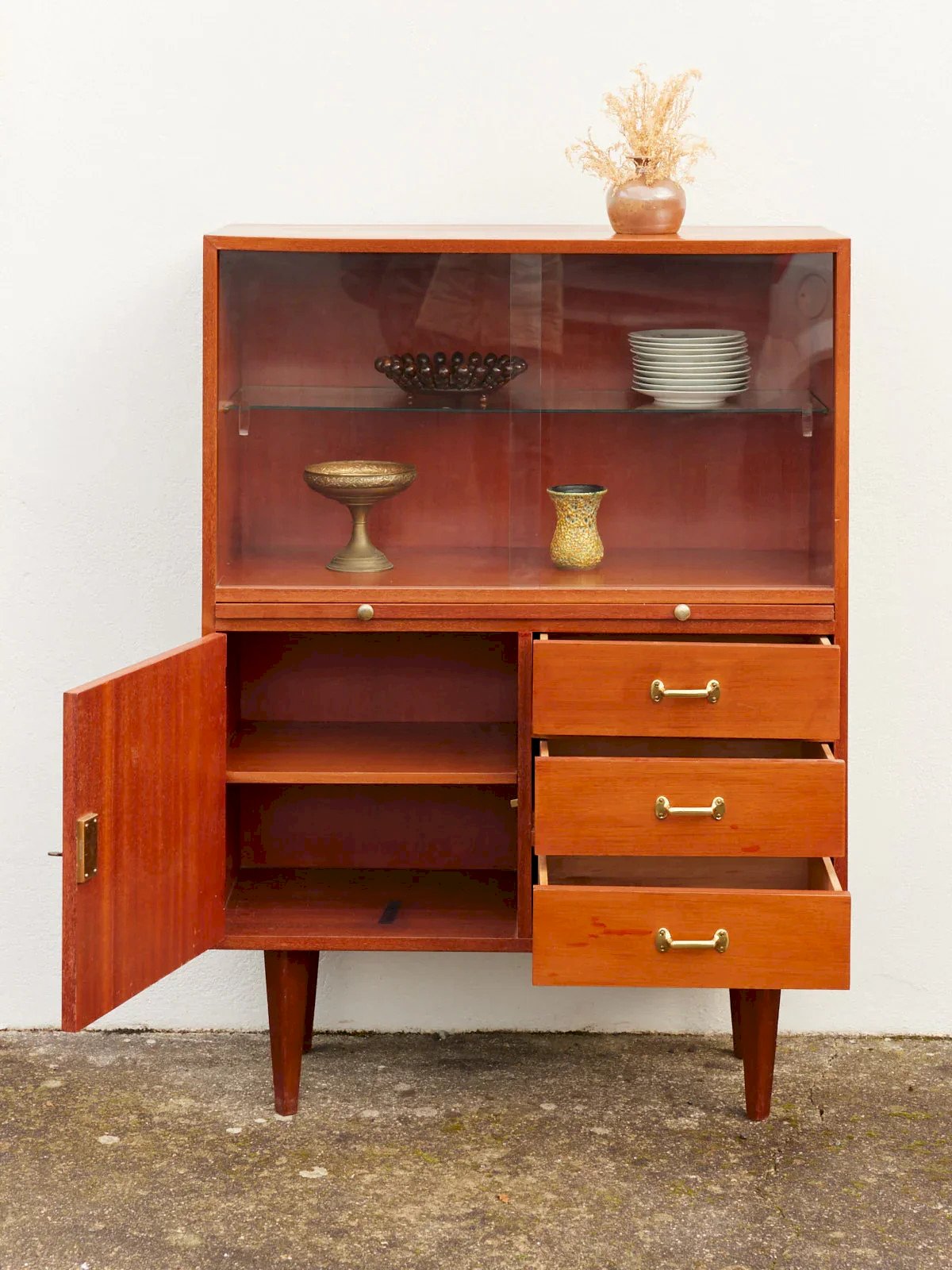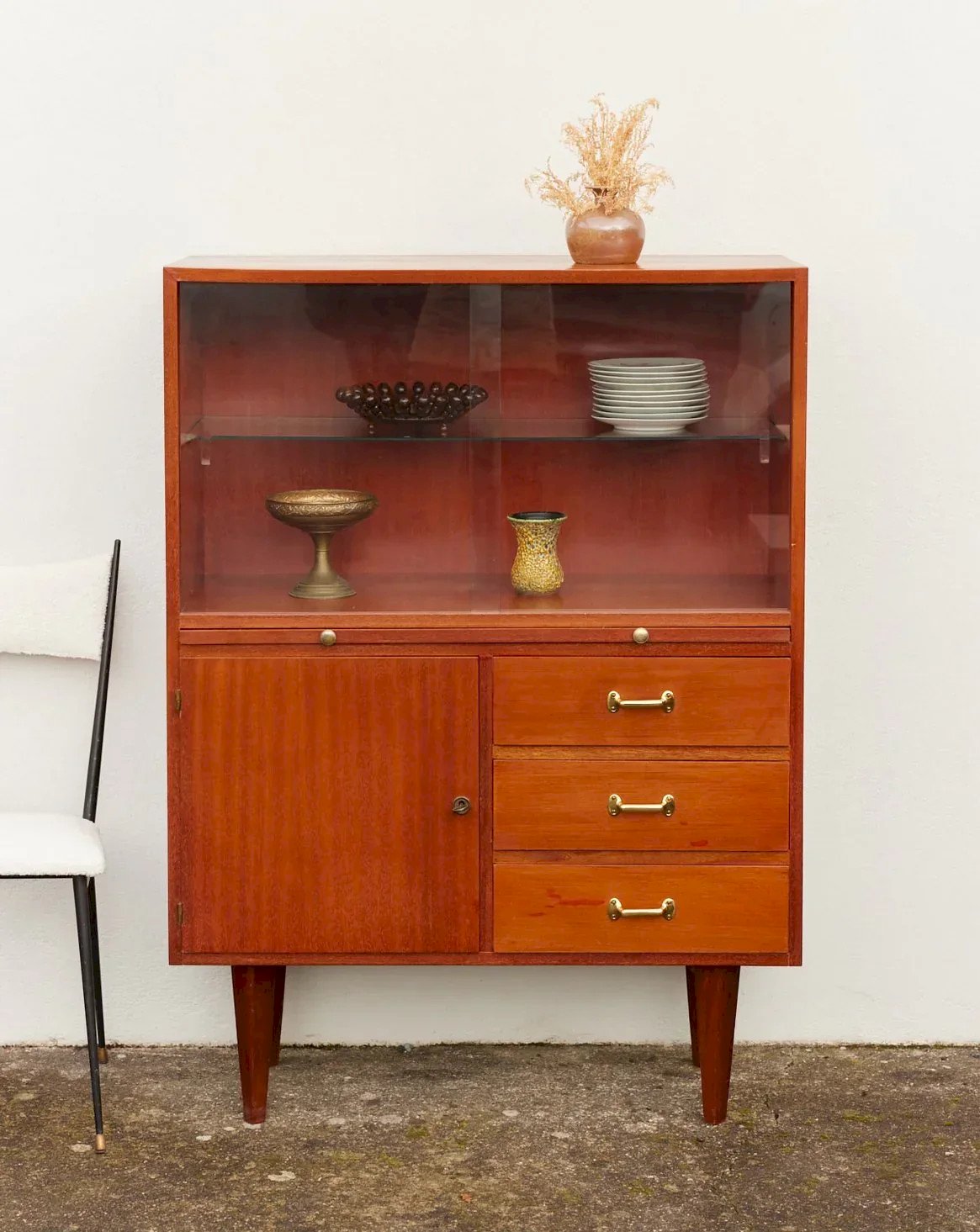 Apportez une touche vintage et raffinée avec cette vitrine en bois, les éléments en laiton ponctue l'ensemble d'un détail délicat. En partie basse, un agencement pratique, trois tiroirs, une porte et une étagère offrent un rangement organisé, tandis que la partie haute propose un plateau coulissant, deux portes vitrées qui laissent découvrir une étagère pour exposer vaisselle ou objets. Ses proportions en font un meuble polyvalent pour salon ou salle à manger, créant une atmosphère chaleureuse et authentique. Longueur : 100 cm Largeur : 40 cm Hauteur : 136 cm État:Occasion: Objet ayant été utilisé. Objet présentant quelques marques d'usure superficielle, ...Occasion: Objet ayant été utilisé. Objet présentant quelques marques d'usure superficielle, entièrement opérationnel et fonctionnant correctement. Il peut s'agir d'un modèle de démonstration ou d'un objet retourné en magasin après une courte période d'utilisation. les éventuelles imperfections. Marque:Debongout Type:Produit chiné Matériau:Bois Style:Contemporain Personnalisé:Vaisseliers et vitrines