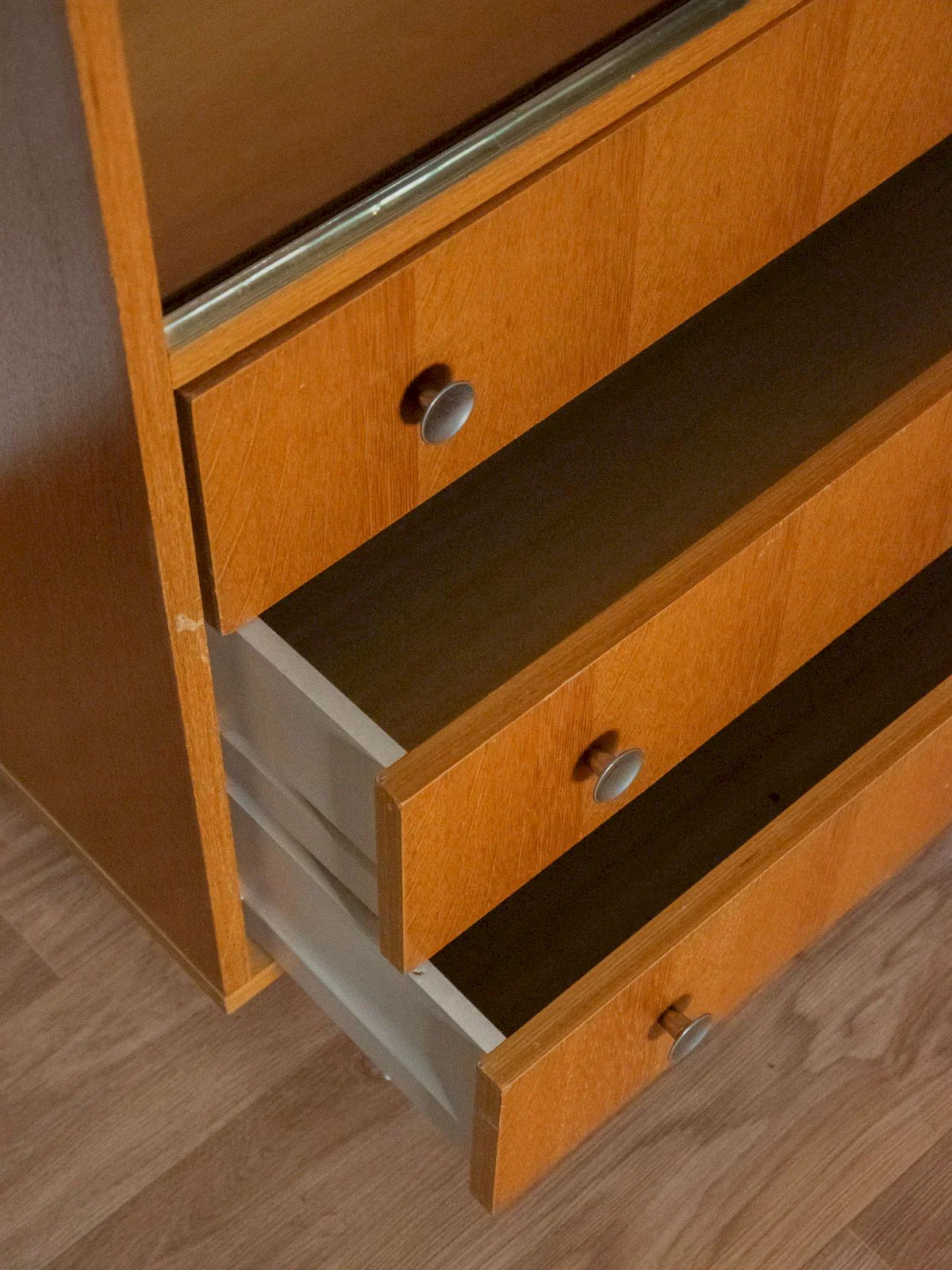 Découvrez cette vitrine en bois clair des années 70 au style sobre et chaleureux, qui apporte une touche rétro raffinée à votre intérieur. Ses deux étagères et trois compartiments offrent une belle modularité pour exposer vaisselle, livres ou objets décoratifs, tandis que les deux tiroirs cachent petits rangements pratiques. Sa surface généreuse et ses proportions verticales en font un meuble lumineux pour une salle à manger ou une entrée, apportant une atmosphère conviviale et soignée. Quelques rayures discrètes et traces du temps. Longueur : 90 cm Largeur : 38 cm Hauteur : 143 cm Hauteur tiroir : 12,5 cm Hauteur de la niche : 25,5 cm État:Occasion: Objet ayant été utilisé. Objet présentant quelques marques d'usure superficielle, ...Occasion: Objet ayant été utilisé. Objet présentant quelques marques d'usure superficielle, entièrement opérationnel et fonctionnant correctement. Il peut s'agir d'un modèle de démonstration ou d'un objet retourné en magasin après une courte période d'utilisation. les éventuelles imperfections. Marque:Debongout Type:Produit chiné Matériau:Bois, Verre Style:Contemporain Personnalisé:Vaisseliers et vitrines