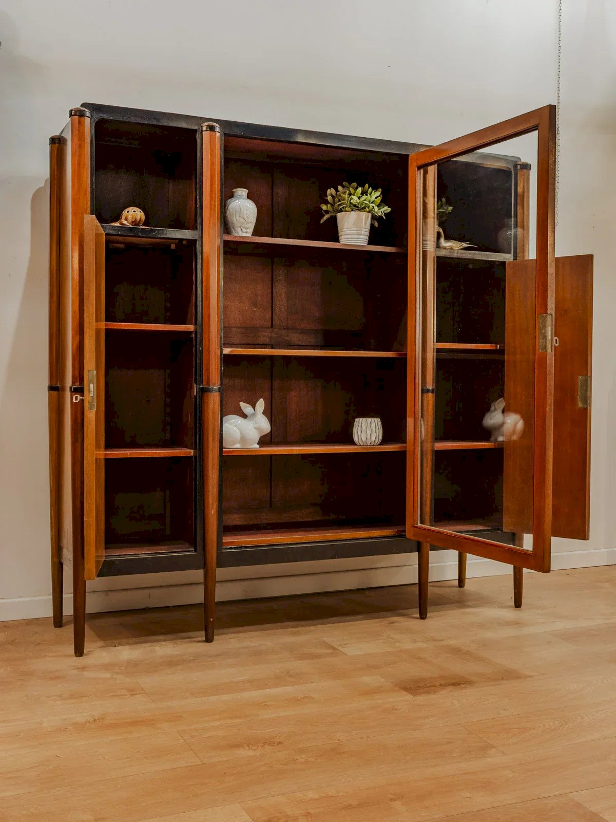 Sublimez votre intérieur avec cette vitrine en placage d'acajou reposant sur pieds, dont le bois et la silhouette structurée apportent une élégance chaleureuse. La partie centrale vitrée s'ouvre grâce à une serrure et une clé pour mettre en valeur objets et livres sur trois étagères, tandis que deux niches et deux portes latérales équipées d'étagères offrent un rangement discret et sécurisé. Idéale en salon ou dans une entrée pour créer une atmosphère raffinée. Quelques traces du temps présentes. Longueur : 152 cm Largeur : 39 cm Hauteur : 154,5 cm État:Occasion: Objet ayant été utilisé. Objet présentant quelques marques d'usure superficielle, ...Occasion: Objet ayant été utilisé. Objet présentant quelques marques d'usure superficielle, entièrement opérationnel et fonctionnant correctement. Il peut s'agir d'un modèle de démonstration ou d'un objet retourné en magasin après une courte période d'utilisation. les éventuelles imperfections. Marque:Debongout Type:Produit chiné Matériau:Acajou, Bois, Verre Style:Contemporain Personnalisé:Vaisseliers et vitrines