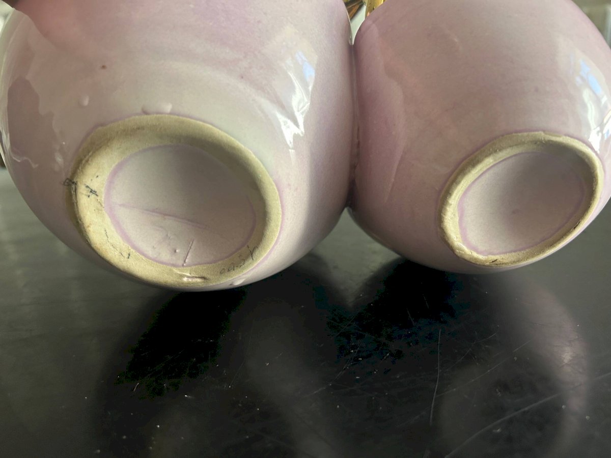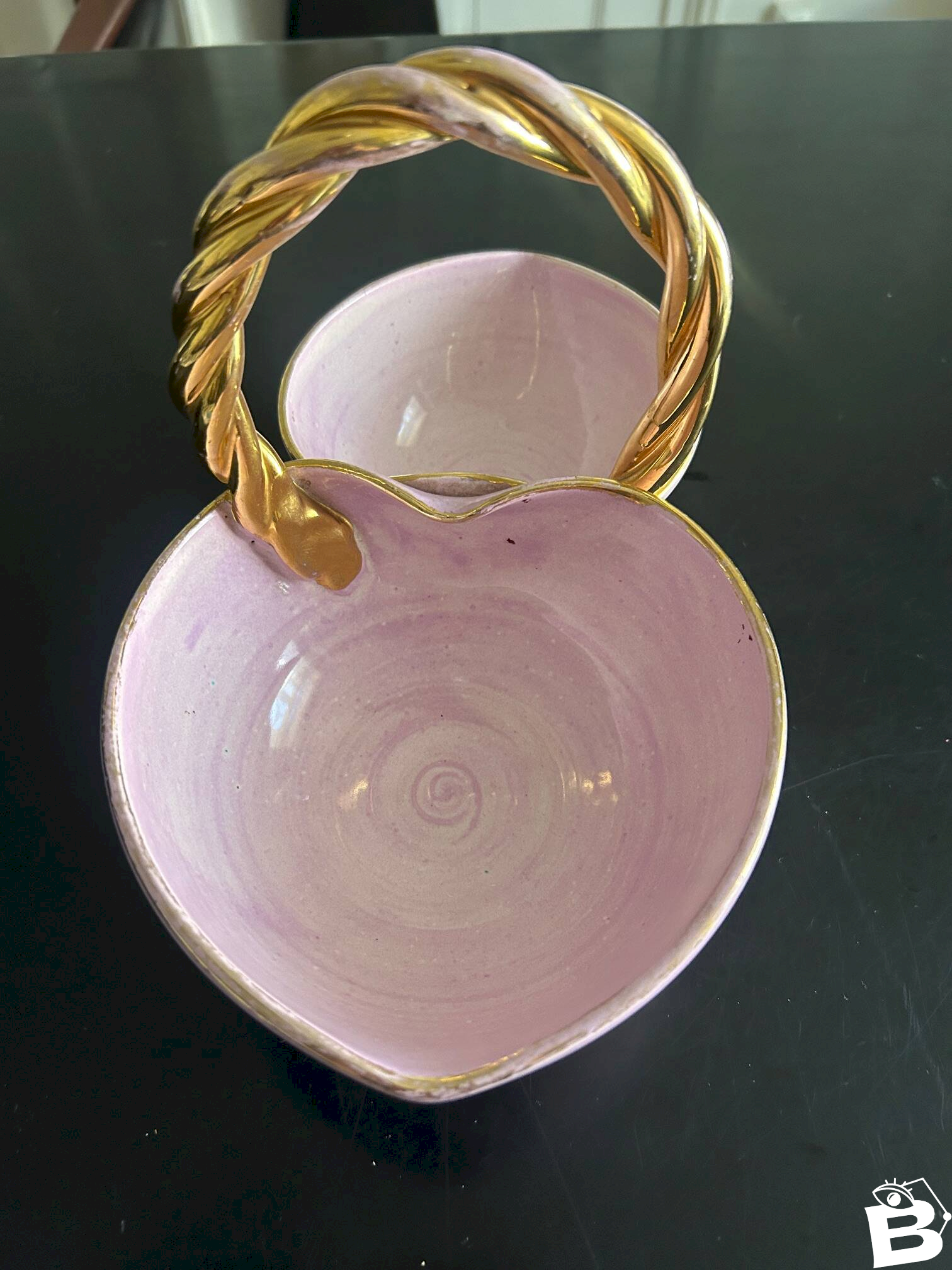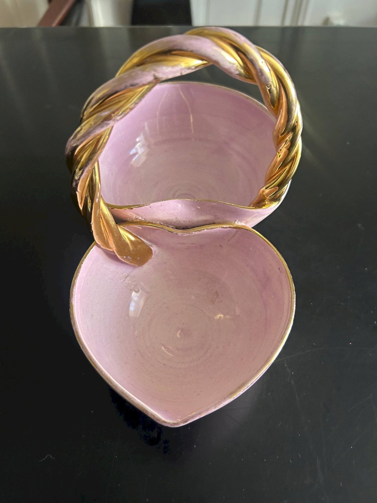 Vide poche des années 50 de couleur rose violet et anse tressée couleur or.