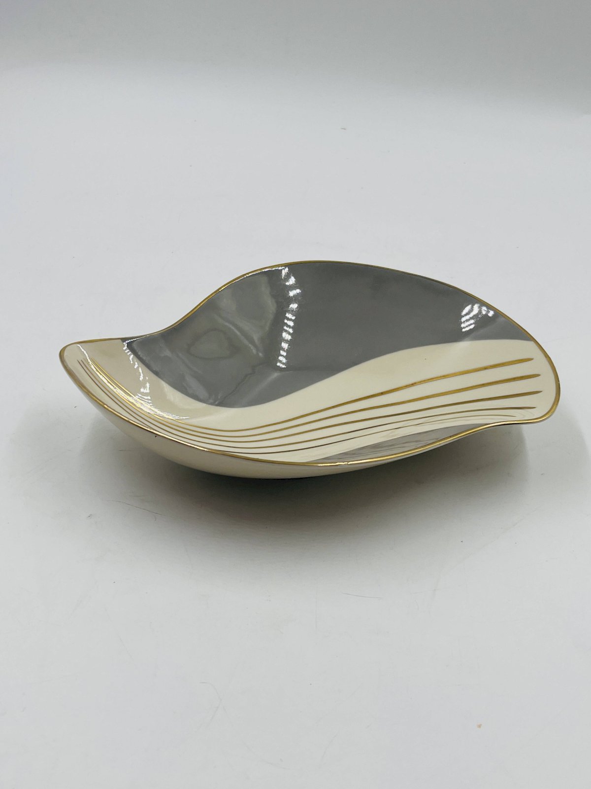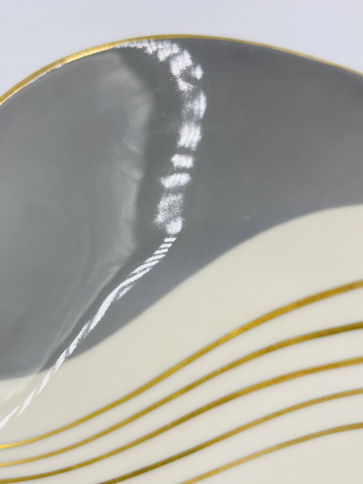Avec ses courbes gracieuses et sa palette de couleurs harmonieuses, cette pièce allie parfaitement esthétique et fonctionnalité, idéale pour ranger vos petits objets du quotidien ou simplement comme élément décoratif.Fabriqué en porcelaine fine, ce vide-poches arbore un design sophistiqué gris et crème, rehaussé de délicates lignes dorées qui lui confèrent une touche de luxe.Son style Mid-Century Modern se manifeste par sa forme épurée et organique, ce qui en fait un ajout polyvalent aux intérieurs contemporains comme classiques.Reconnue pour sa qualité, la marque Edelstein Bavaria garantit que cette pièce n'est pas seulement pratique, mais aussi une véritable œuvre d'art.Add this distinguished piece to your collection and enjoy the subtle sophistication it brings to your home.Dimensions; 24 X 18 X H 4 cm.