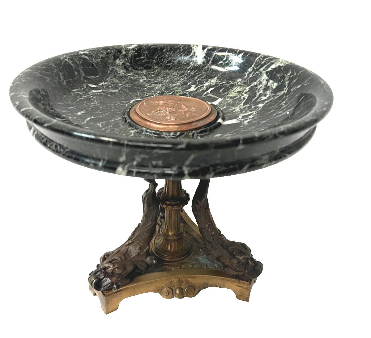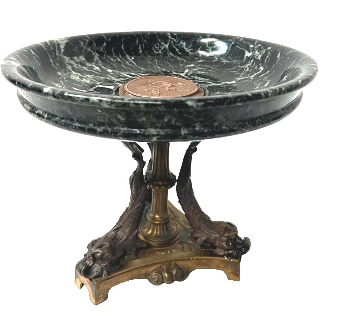 Vide poche en marbre et bronze Napoléon III Coupe en marbre vert de mer  Piétement en bronze ciselé a décor de dauphins  Bon état  Dimension  H 24 cm par 28 cm de diamètre Epoque XIX siècle    Type:Objet de vitrine, Décoratif Origine:France Pays d'origine:France Hauteur:24 Matière:Bronze Style:Napoléon III Longueur:28 Largeur:28