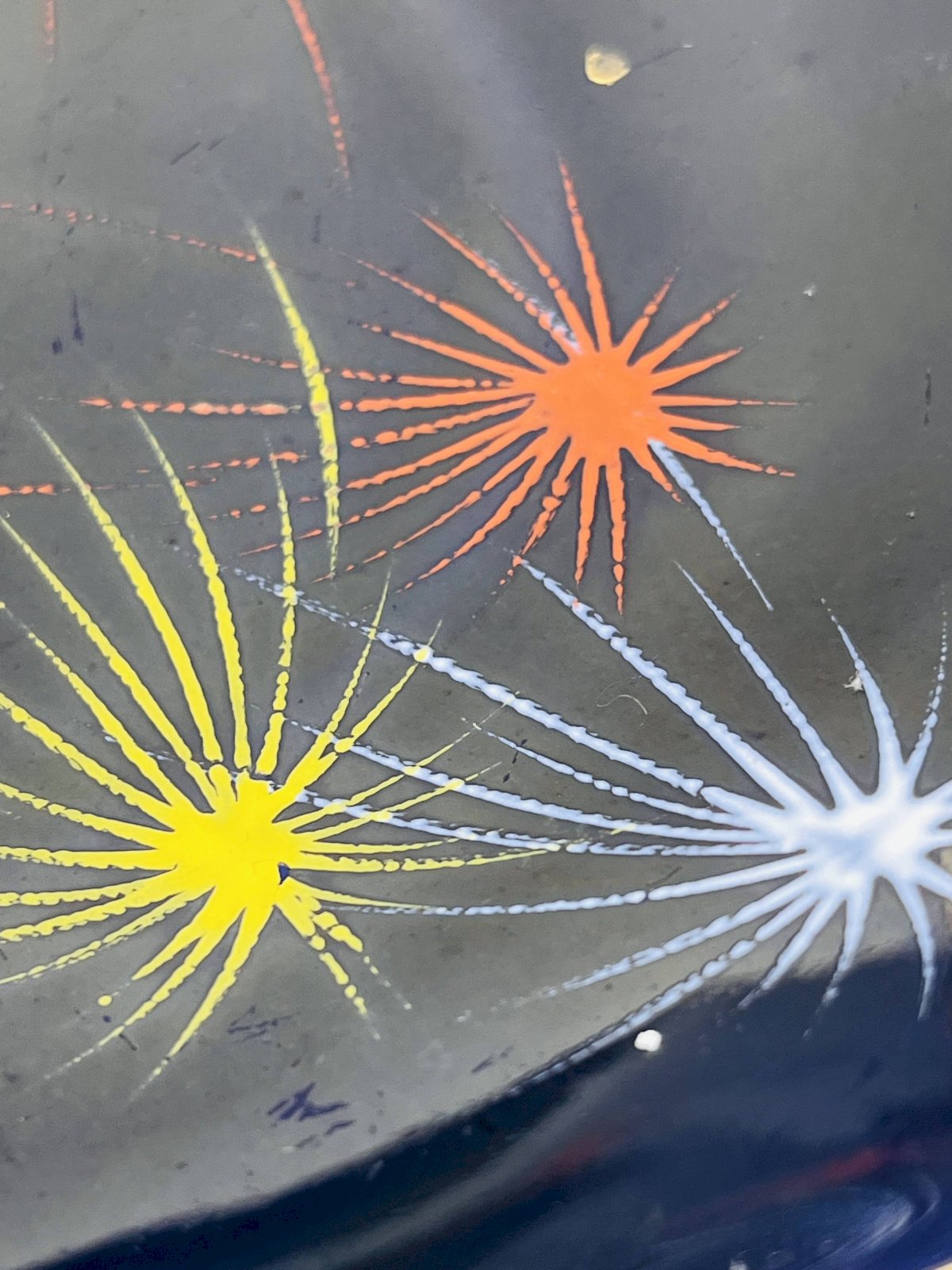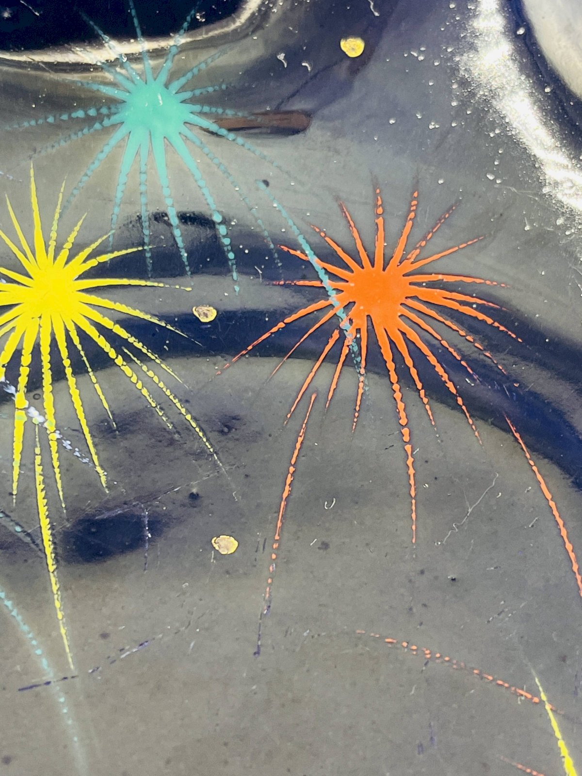 Conçu en céramique de haute qualité, ce vide-poche présente une finition noire brillante rehaussée de motifs multicolores et d'un bord doré raffiné.