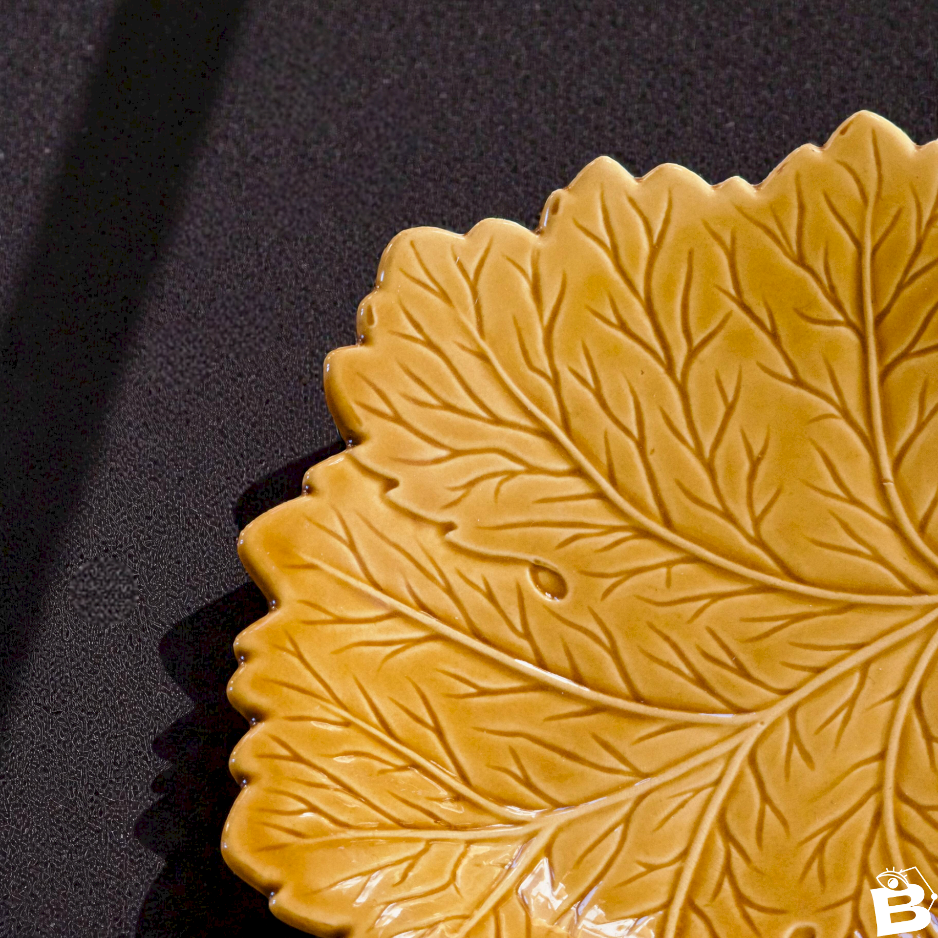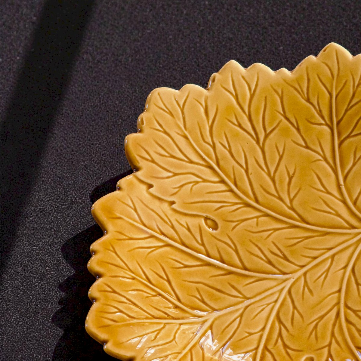 Grand vide-poche vintage en barbotine en forme de feuille.Douce couleur jaune ocre.