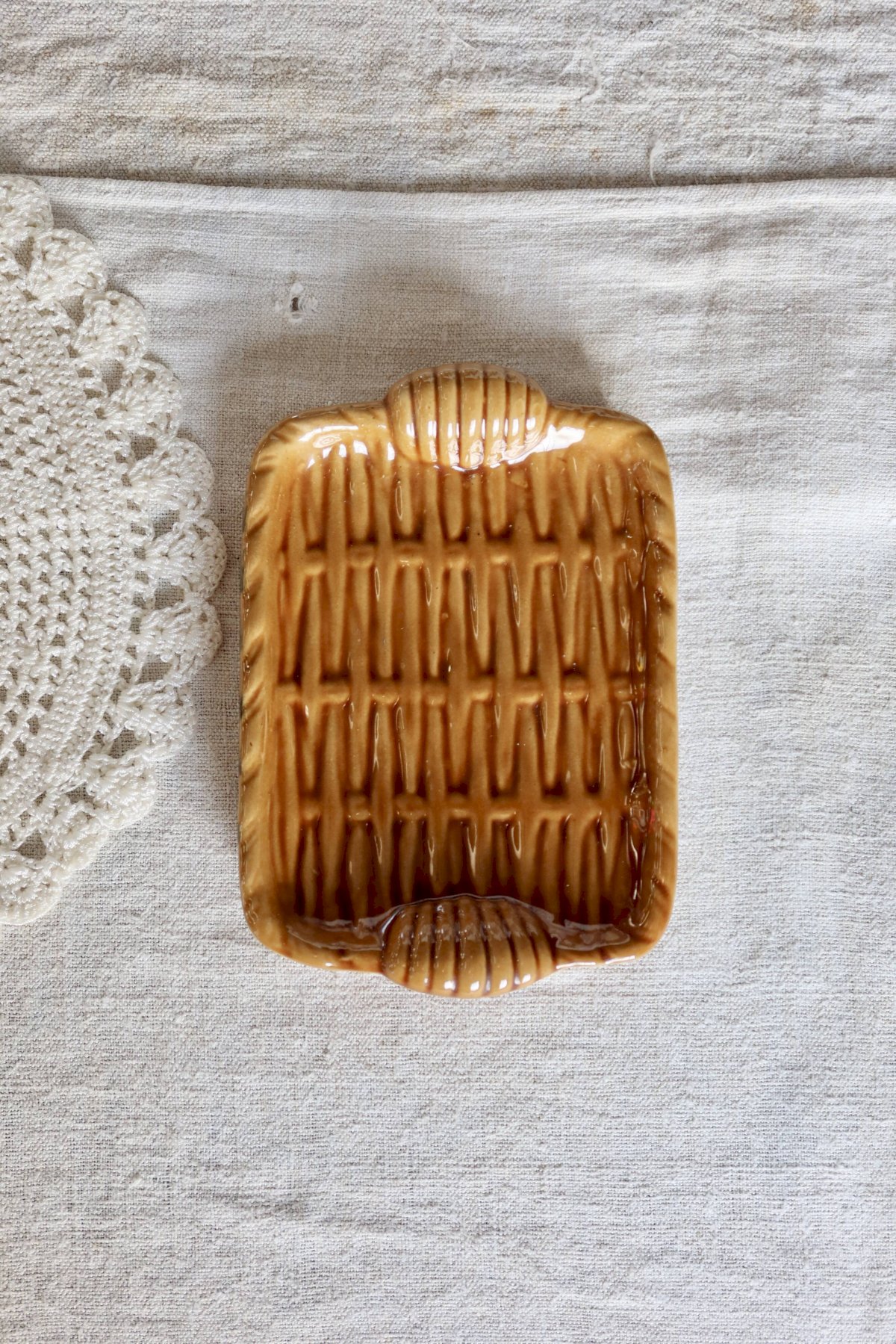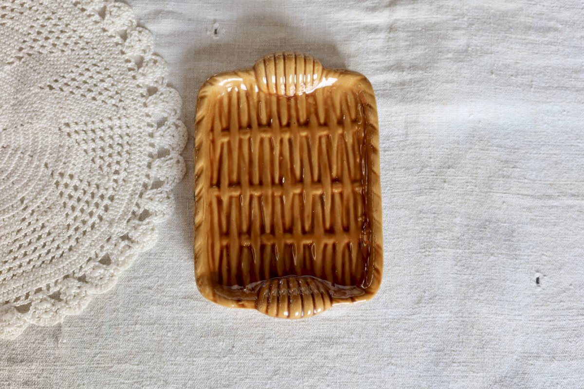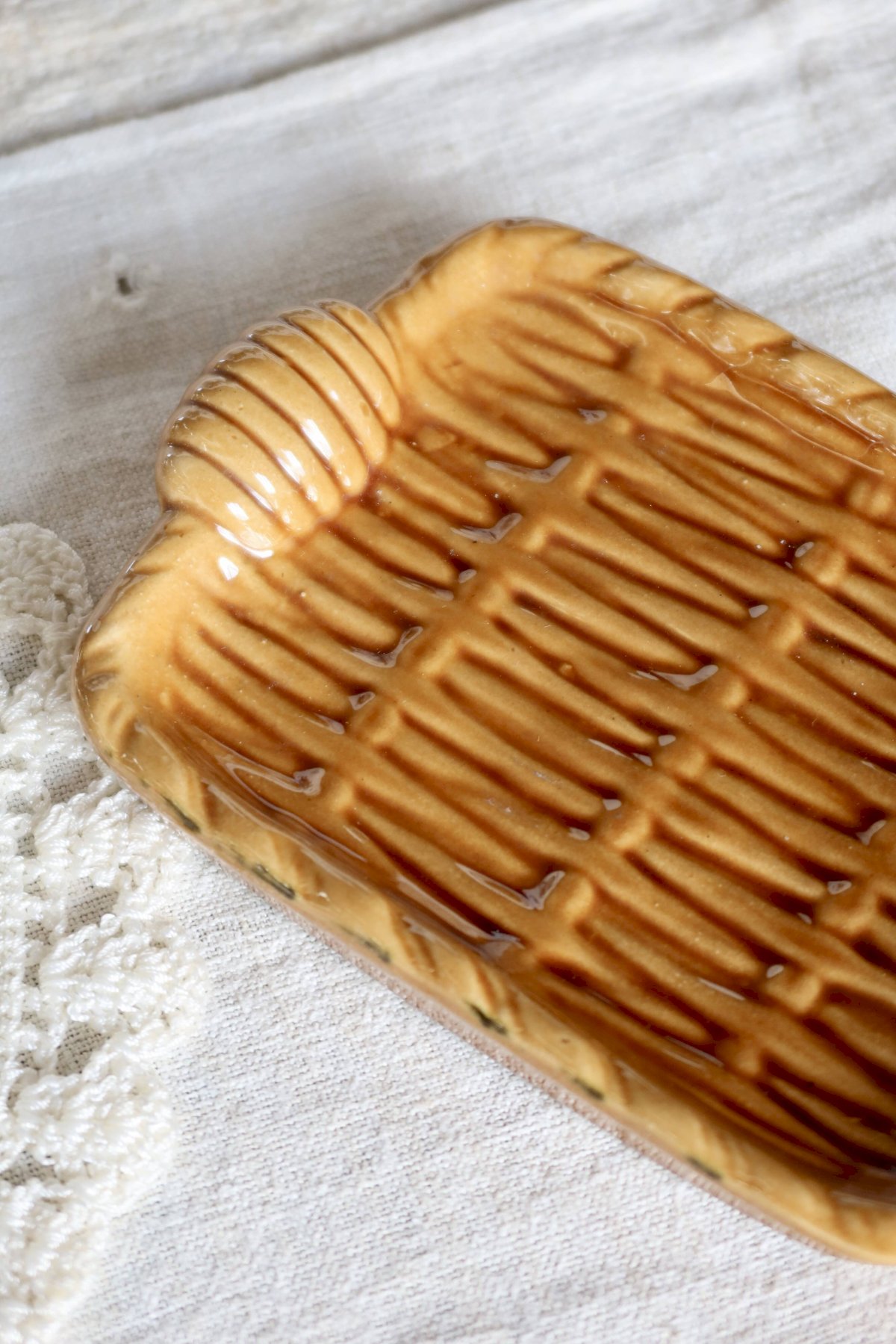 Vide-poche vintage en céramique couleur moutarde effet tressé