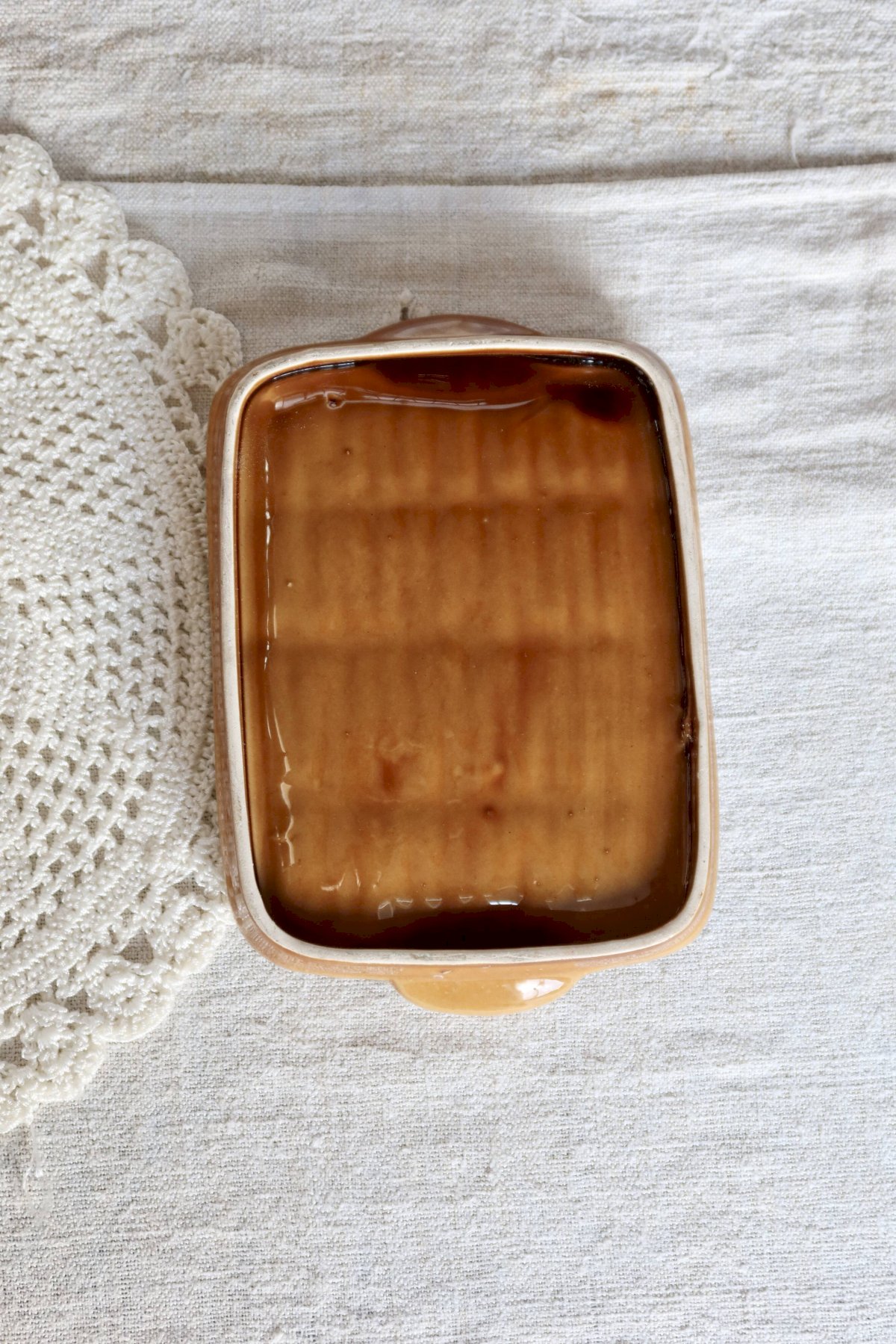 Glaçure brillante qui capte bien la lumière; teinte ocre chaleureuse typique des pièces vintage.