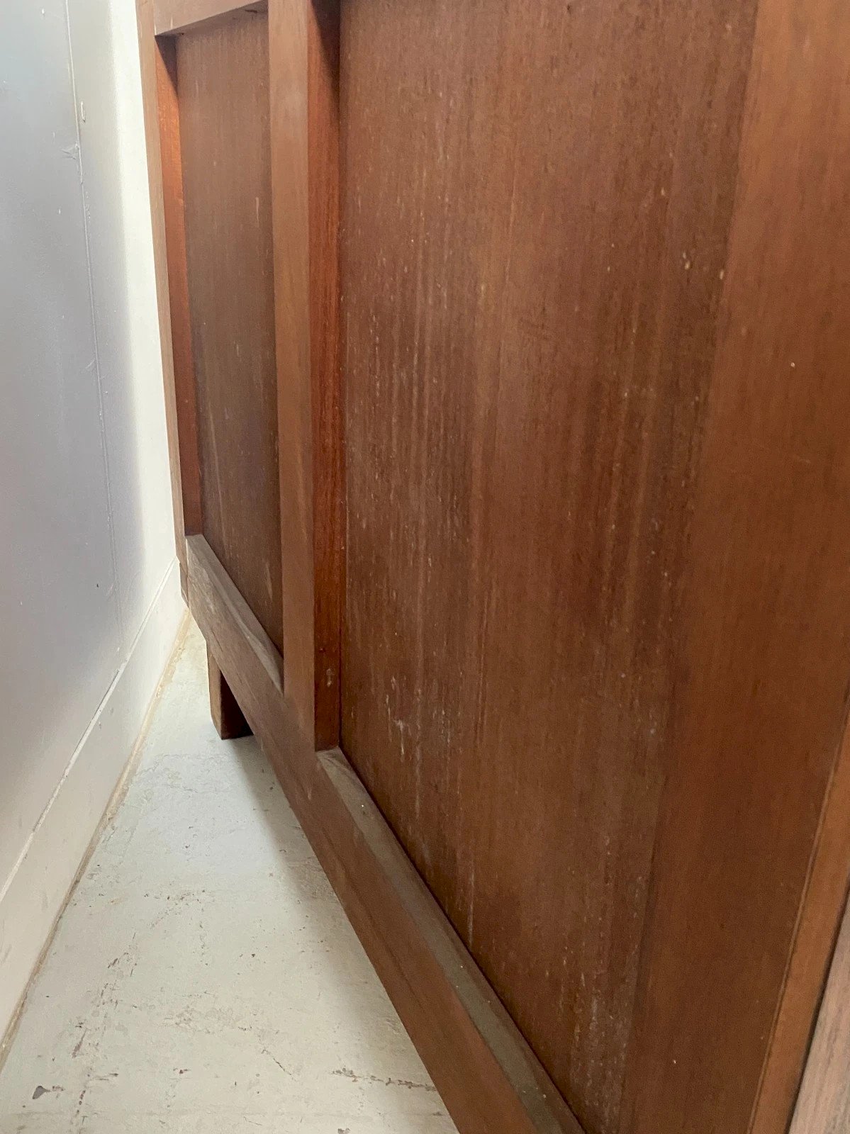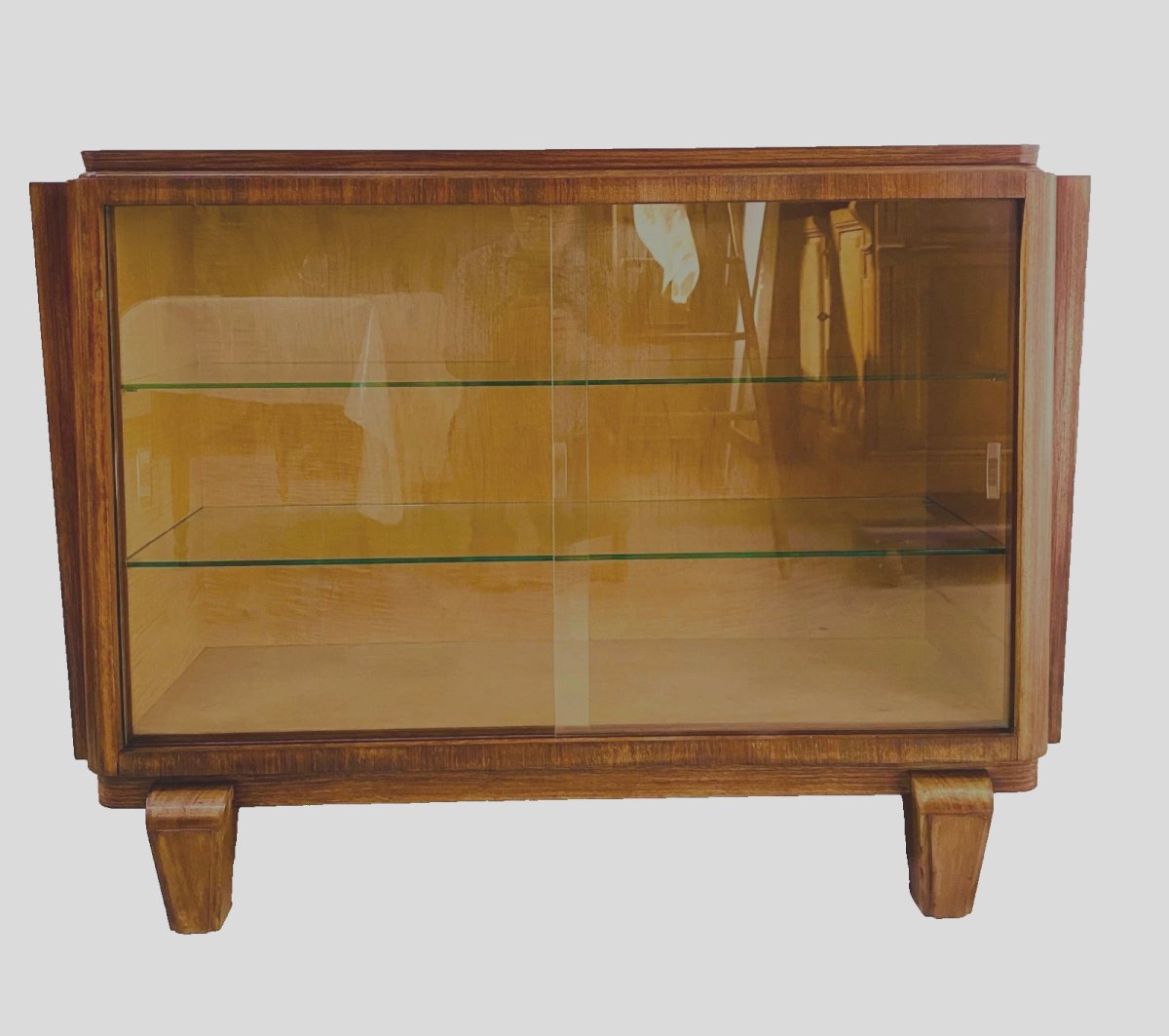 Vitrine Art Déco en acajou et placage d'acajou Deux portes coulissante  en verre épais  L'intérieur est en bois de placage jaune  Deux étagères en verre épais  Bon état  Dimension  H 96 x L 133 x 46 cm  Epoque Art Déco  Type:Vitrine Origine:France Sous-type:Basse, Petite Hauteur:96 Matière:Acajou Style:Art Déco Longueur:133 Largeur:46
