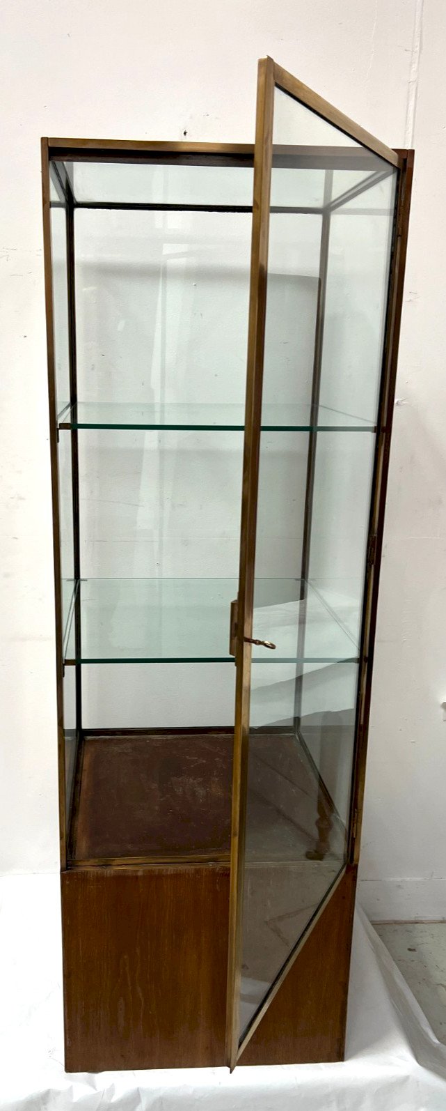 Vitrine de magasin en laiton posé sur un socle Une porte en façade avec sa clé Socle en placage de chêne Bon état  Dimension  H 150 x L 50 x 50 cm  XX siècle   Période:Art Déco Origine:France Hauteur:150 Longueur:50 Largeur:50