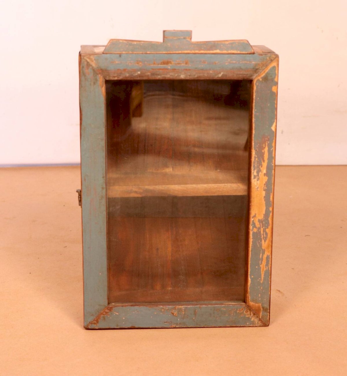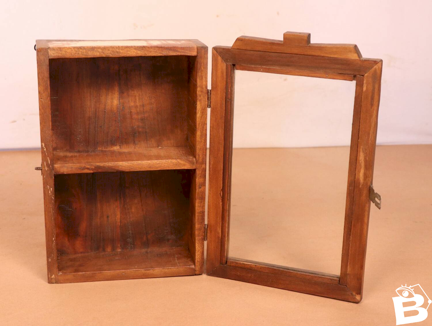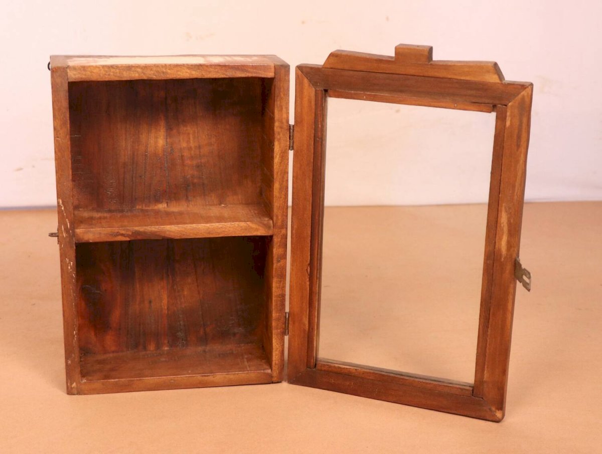 Vitrine murale en teck birman patine polychromée d'origine / 2 accroches arrière pour fixation murale / hauteur intérieure des étagères du haut vers le bas: 14 / 15 cm / 3 kg.