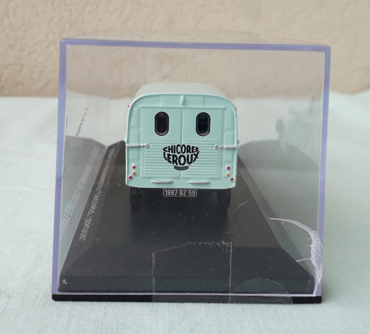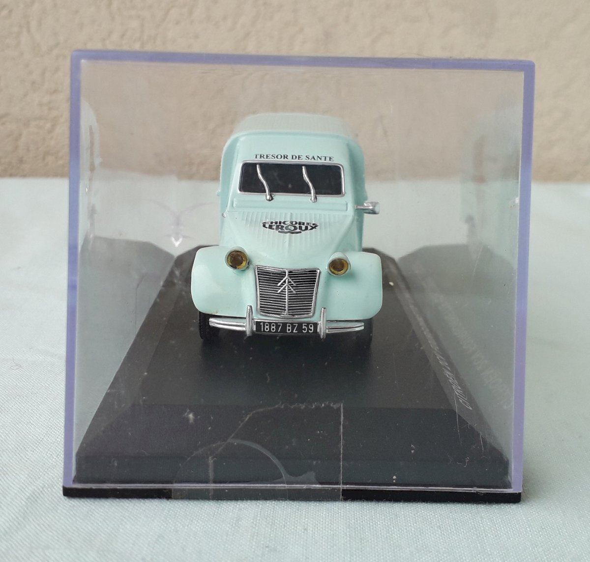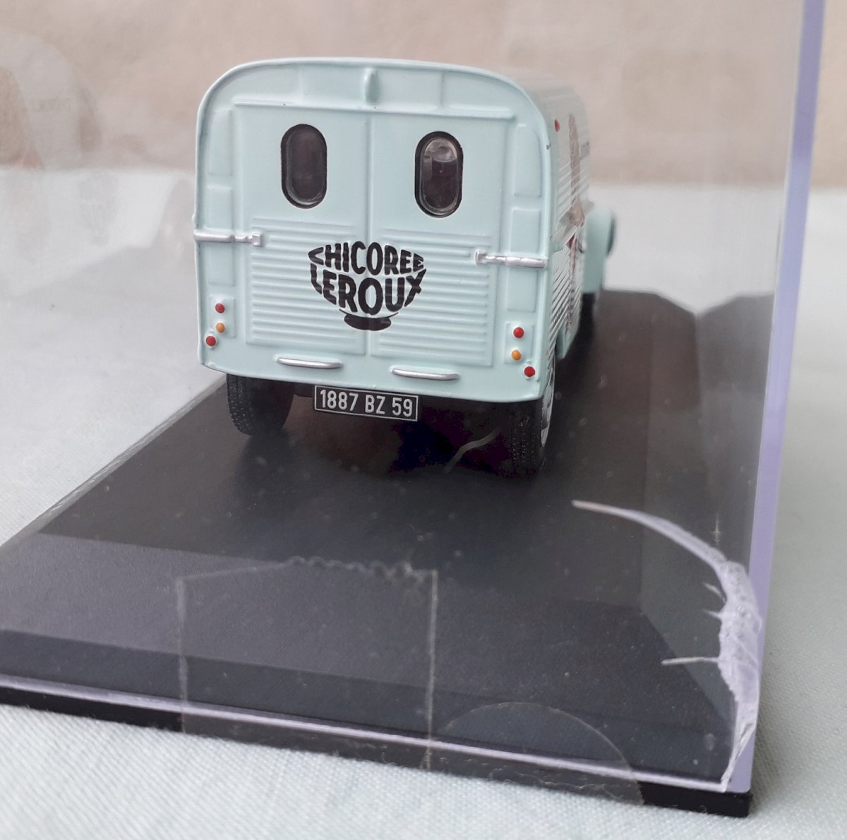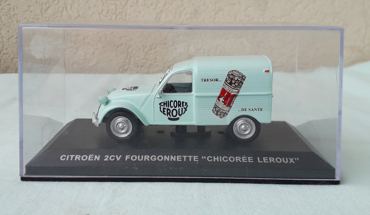 Voiture miniature Citroën 2 CV Fourgonnette "Chicorée Leroux", dans sa boite plastique.